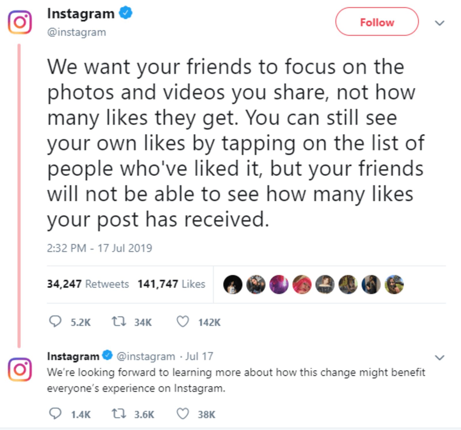 On July 17, 2019, Instagram tweeted saying, “We want your friends to focus on the photos and videos you share, not how many likes they get. You can still see your own likes by tapping on the list of people who’ve liked it, but your friends will not be able to see how many likes your post has received.”