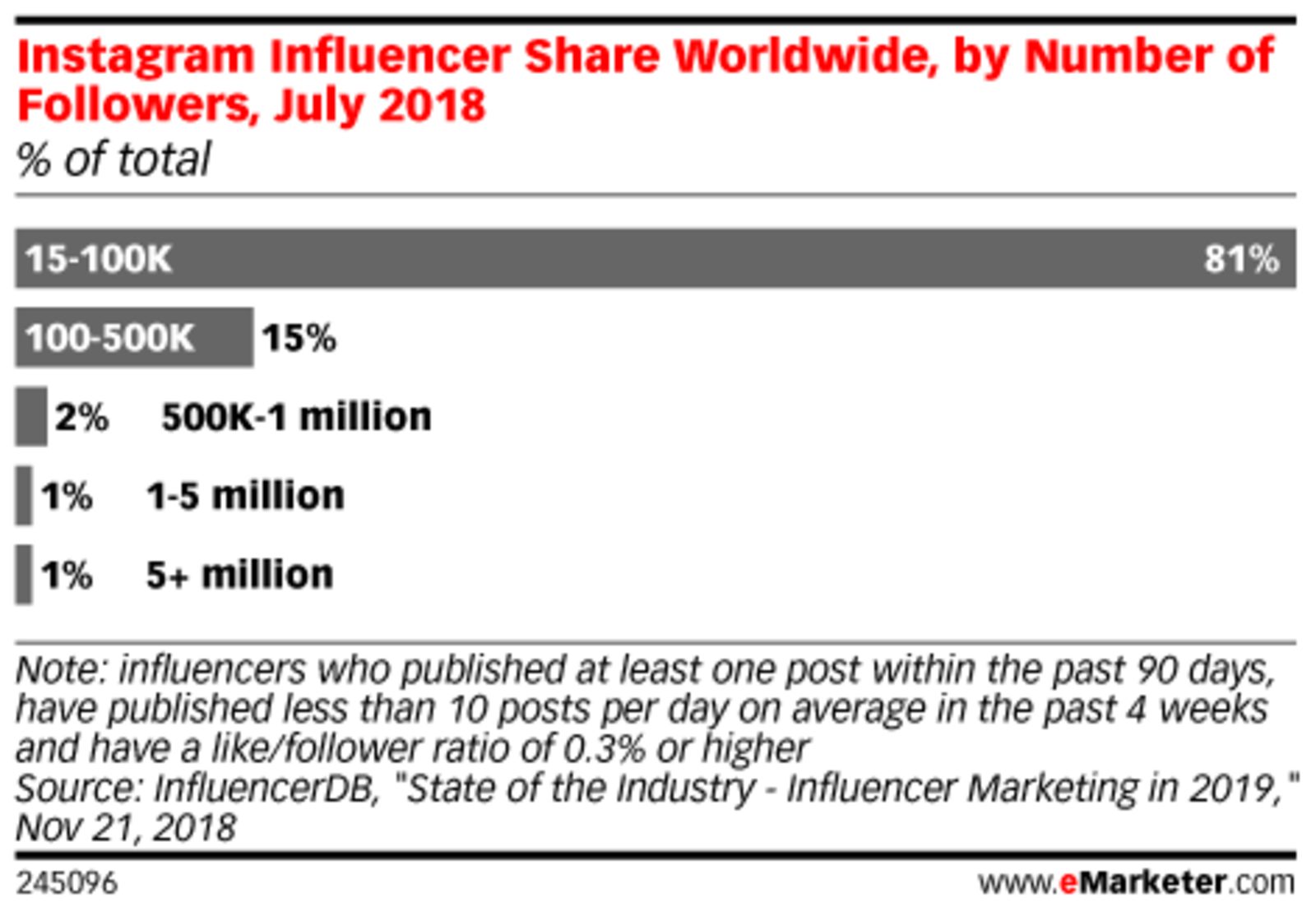 According to a study by InfluencerDB in 2019, more than 500,000 active influencers are operating just on Instagram. That equates to 39% of Instagram accounts with more than 15,000 followers and 81% having followings between 15,000 and 100,000 users.