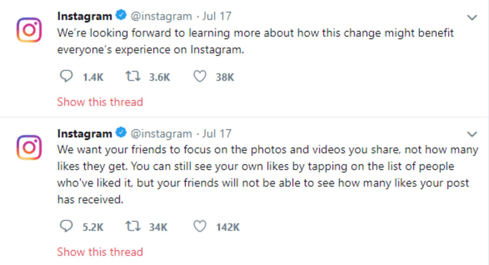 With the idea of removing likes from Instagram — Instagram sent out these tweets: