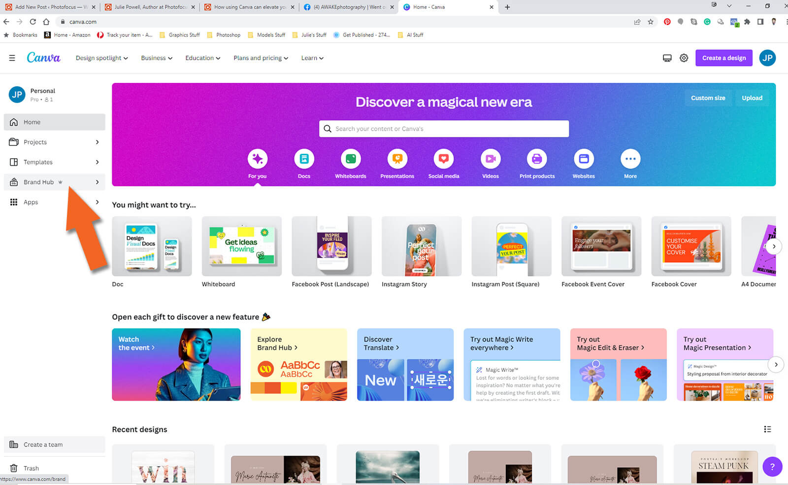 Head over to Canva and select Brand Hub from the left-hand side. Remember, this is an option for Pro accounts (it has the little Crown). You can then see all Brand Kits you have, if any and you can easily create a new one. Of course, you can edit any current brand kits here as well. You can have multiple Brand Kits too.