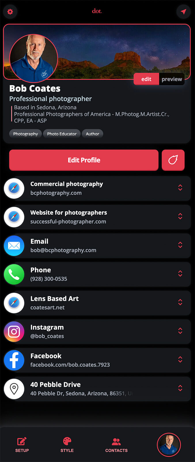 Dot also creates a QR code for you that can be shared as well if you have trouble with your Bluetooth. It looks like the one below. Scan it with your phone if you would like to instantly access my commercial, art and photographer websites. Oh, and my email and phone number as well. You can choose how much or how little, information you load into your Dot Card, or set up multiple cards for an additional charge. You can even make this company-wide if you have multiple employees.