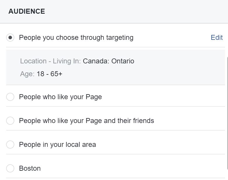 The audience might be the most important part of creating an ad. It’s also Facebook Ads’ most powerful tool. You’ll have a few default options (you can see mine below) that might be suitable and if you want to target people in your area or people who like your page.