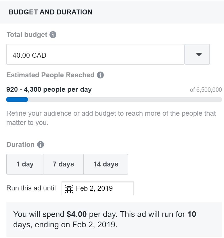 This is the second most important setting: How much money will you spend and for how long will the ad run? You pick the total budget and when the ad will run until (either a duration or an end date). Then Facebook will automatically spread your budget over the period you picked.