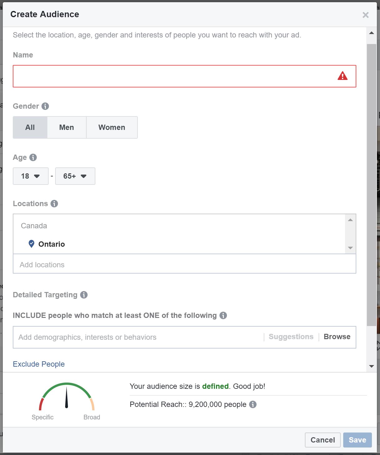 However, audiences are much more powerful and you can create your own by clicking on Create Audience. There are several parameters you can play with: Gender, age, locations and targeting. Gender and age are simple. In locations, you can target a country, a state or small areas like a city. You can target multiple locations.
