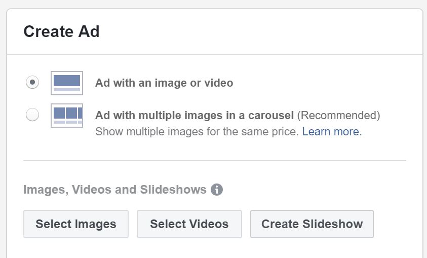 The next step will be when you create your ad. You will be able to upload up to 10 images, videos or slideshows.