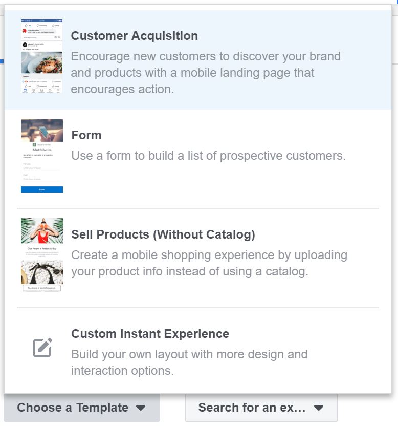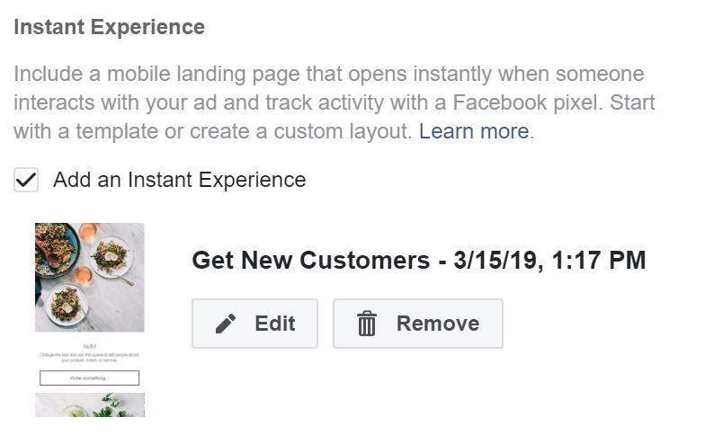 Instant Experiences are a more recent feature. Ever clicked on an ad and it expanded to full-screen with more content? That’s an Instant Experience!