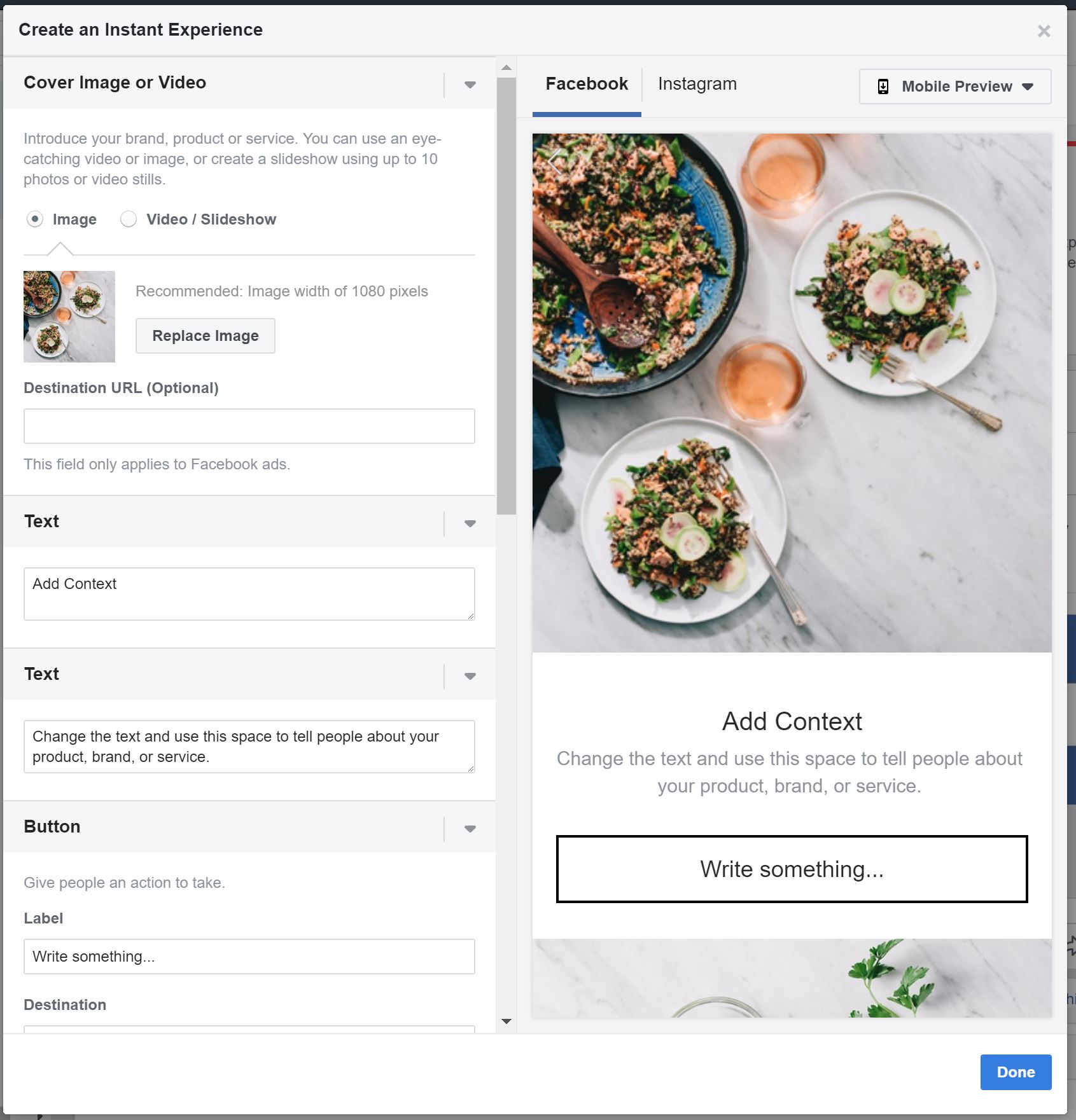 Once your Instant Experience is ready, click on Done. It will come up on the main Ad screen like this: