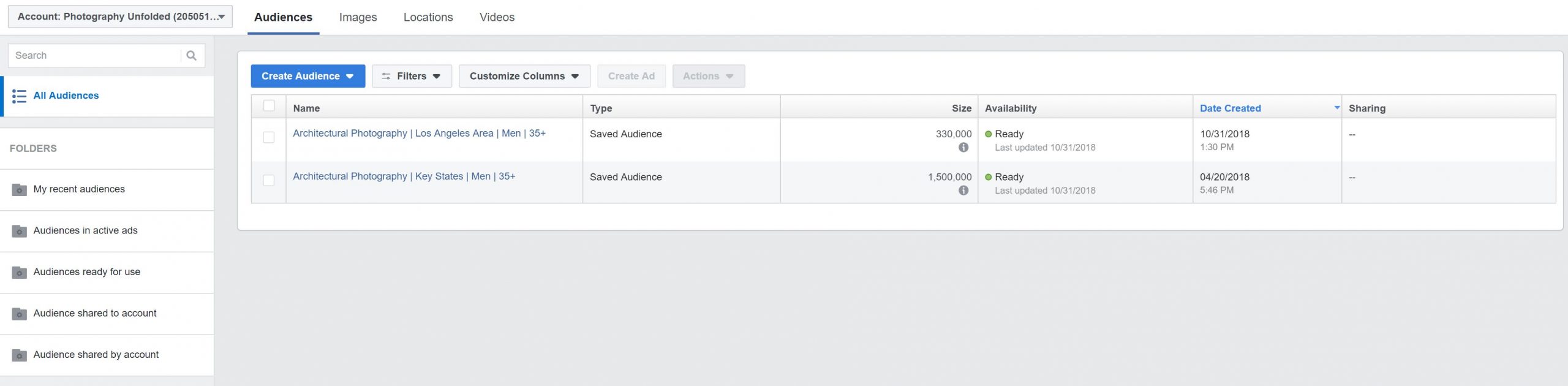 There are many other features in the Ads Manager if you click on the menu in the top left corner of the screen. Most of it is very advanced and we’ll discuss some of it in future articles. For now, I want to focus on the Audiences screen, one of the main features of Facebook Ads. On this screen, you can see you existing audiences and edit them.