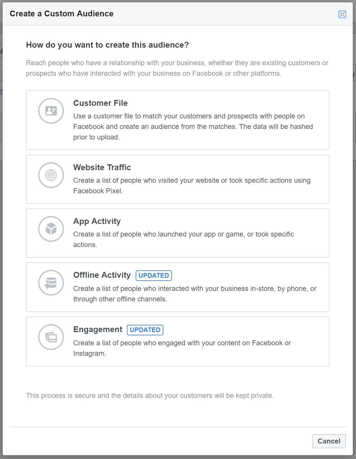 A Custom Audience is created from other sources, as you see below. It’s useful if you have an online store, a Facebook App, etc.