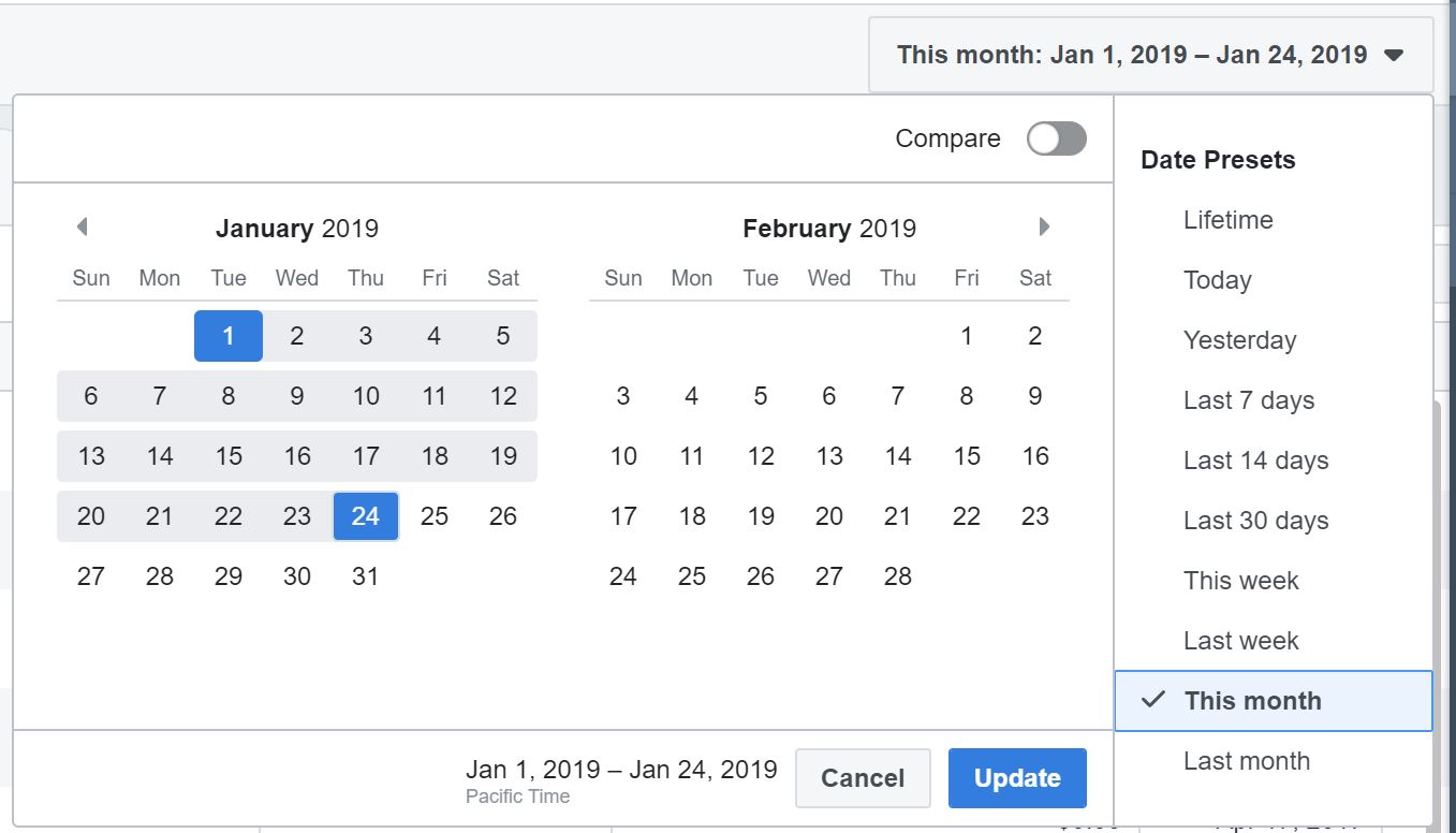 By default, it’s set to this month. If you have previous campaigns and you want to compare them, I suggest you click on the dropdown and pick Lifetime at the top right. You can also pick specific dates as you wish.
