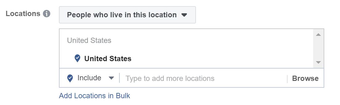 The Locations tab allows you to target people very specifically. With the dropdown, you can pick people who live there vs people who are traveling there, and more. You can include and exclude locations. The types of locations you can use are countries, state/regions, cities, postal codes, addresses, DMAs and congressional districts.