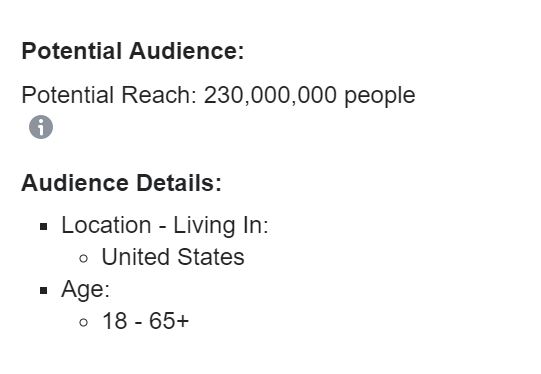 Finally, the last thing you need to pay attention to is the information on the right side of the pop-up: the Potential Audience. It tells you what your potential reach is. In my case, the default being people aged 18+ in the US, the potential reach is 230M+. You want to narrow it down to a number in the thousands or tens of thousands. If the number is too big, you are not targeted enough. If it’s too small, your ad won’t be shown to many people. Something we’ll explore more in the next article.