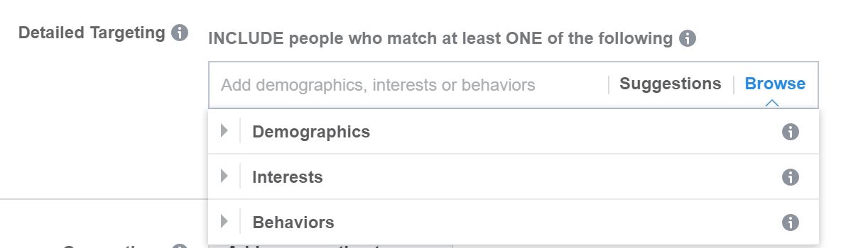 Detailed Targeting allows you to target people who have specific demographics, interests or behaviors. It goes really deep, into things like financials, life events, shopping history, etc.