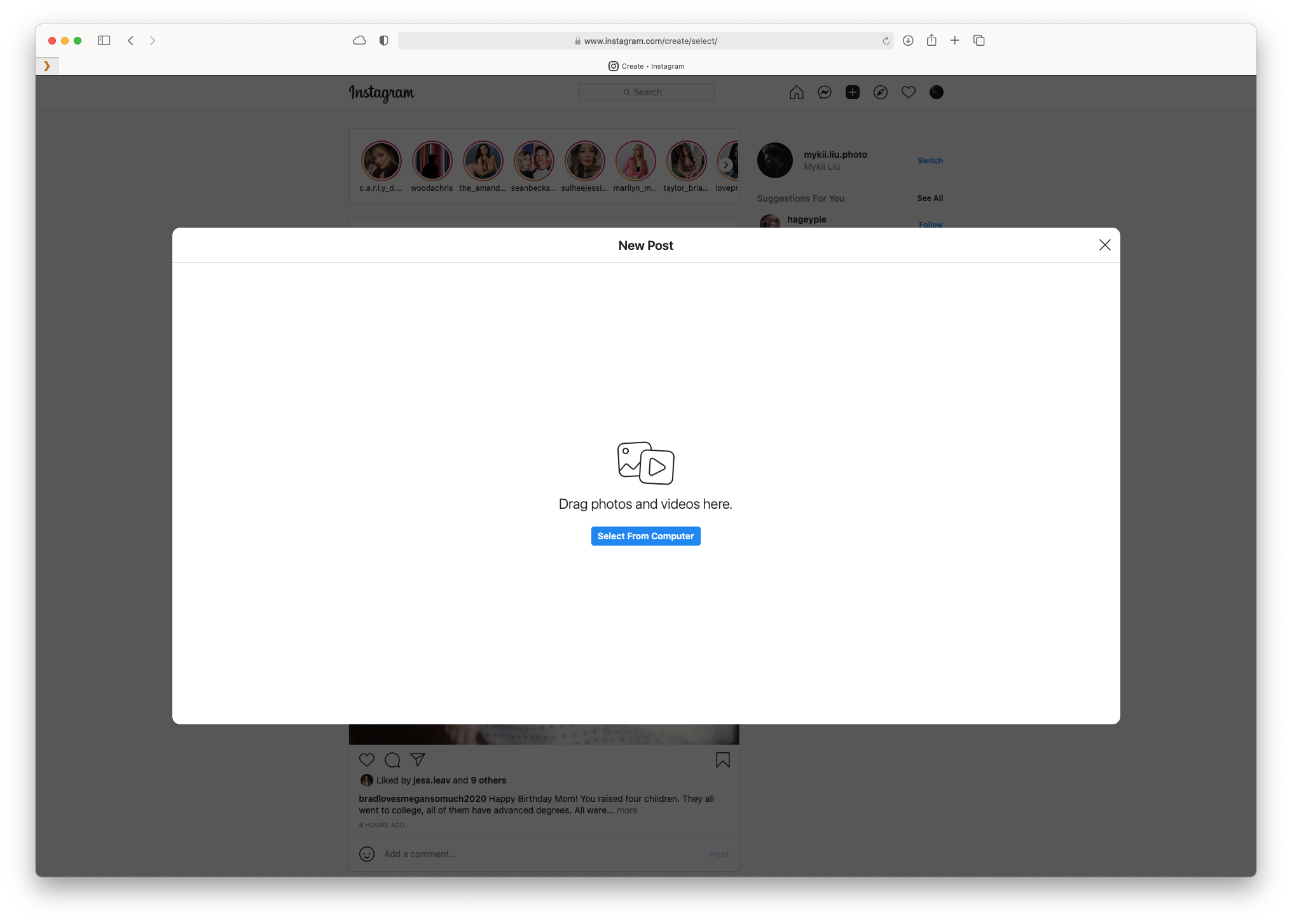 It must be a Mac feature. I just tried Firefox, Chrome, and Edge browsers along with the Instagram app on my PC and it wasn’t available. I have been using a hack with Chrome to post from my computer for several years from a post here on Photofocus: https://photofocus.com/photography/how-to-post-to-instagram-from-your-computer-easy-as-a-b-c/