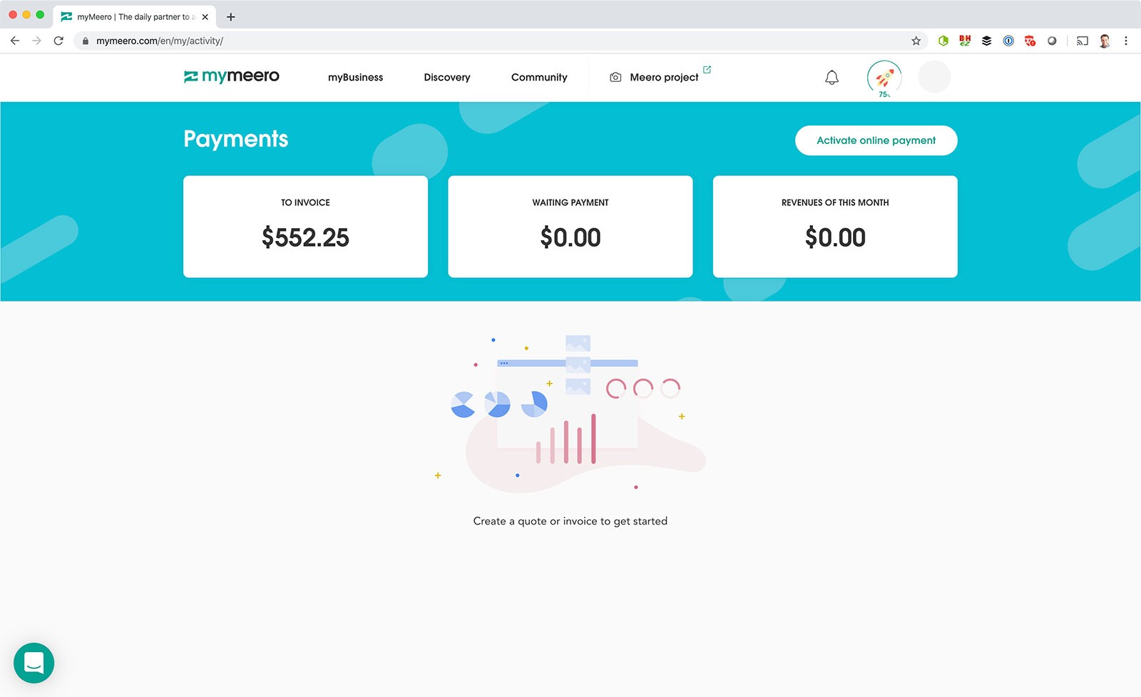 Across the top, you’ll see four tabs — myBusiness, Discovery, Community and Meero project.