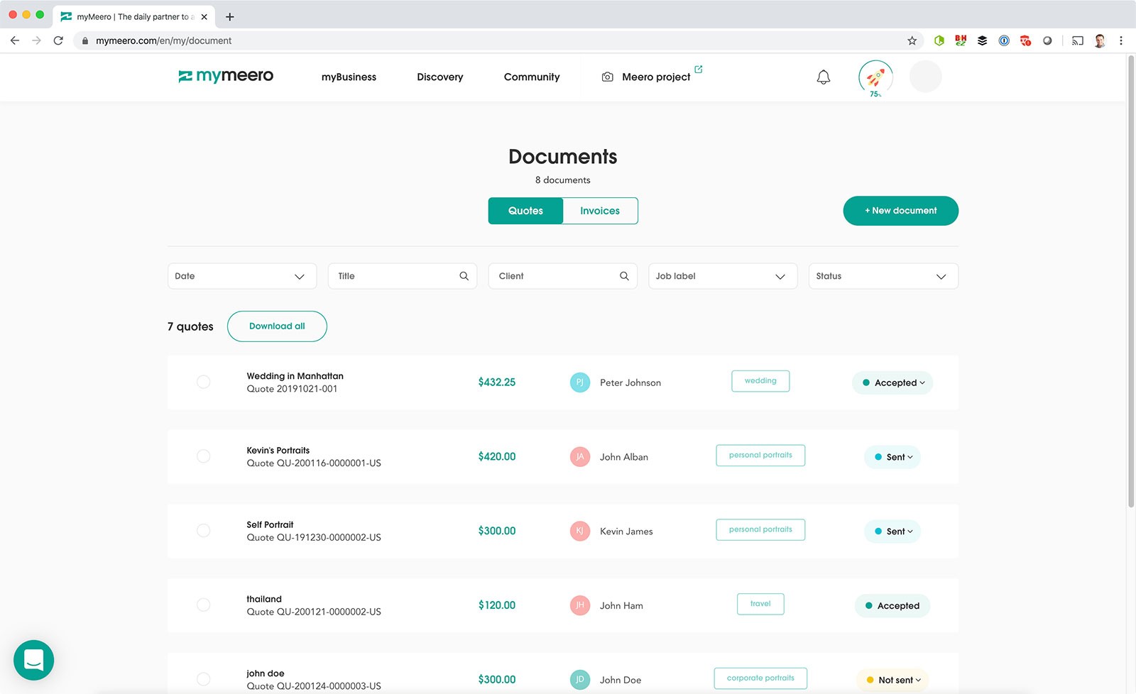 myBusiness is the new part of Meero, allowing you to organize things like your jobs, clients, documents and more. Think of it as a good starter studio management platform.
