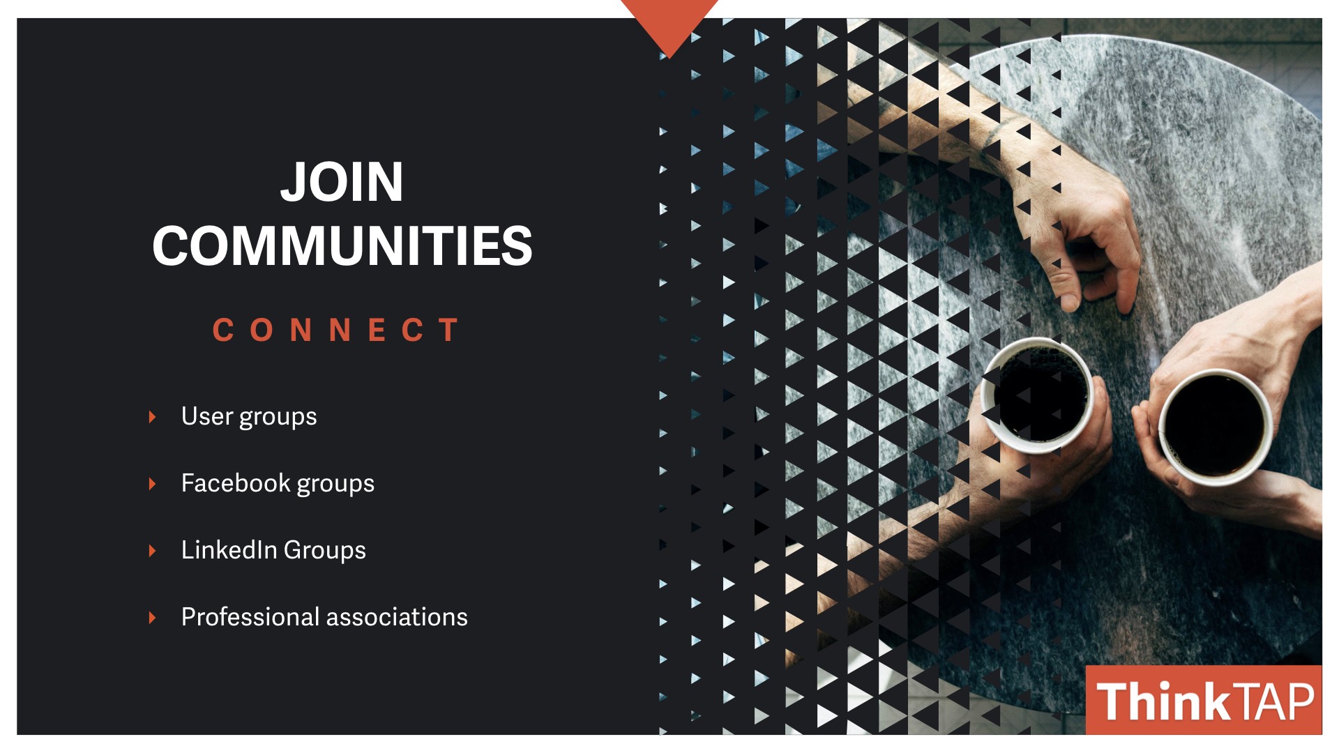 Join communities, not just online ones. Those are fine, but the reality is so much better. You’re going to want to find communities that you could be a member of user groups, people that share a similar interest in a tool. They can help answer questions when you have them as well as expose you to new ideas.