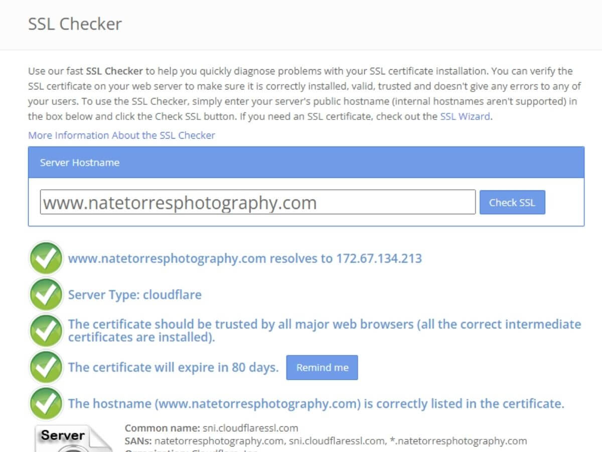 Let’s bypass the technical jargon. The crucial point is that HTTPS increases your site’s security, and search engines favor secure sites. This can boost your website’s ranking for photography-related keywords. Curious if your site has HTTPS? Just visit an SSL Checker website, enter your URL, and check for an SSL certificate. Here’s an example from when I checked my own site, showing it’s secure: