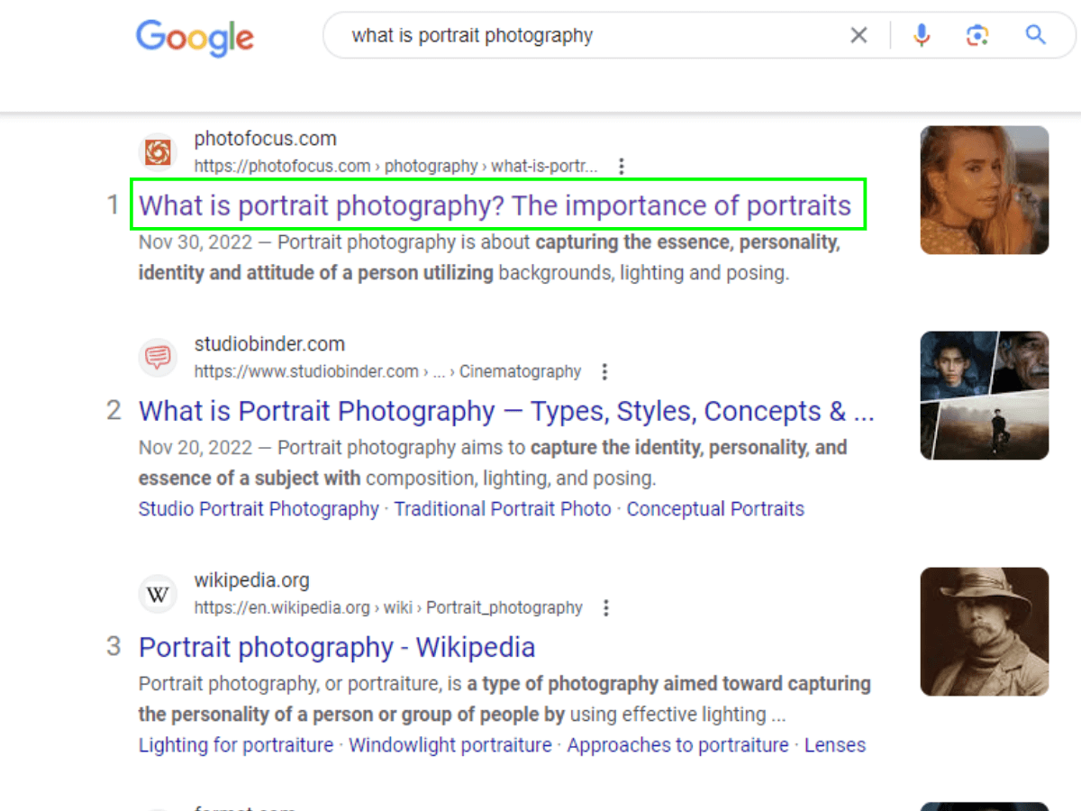 Let’s say your target is “new york portrait photographer.” That ought to be your H1. Now, this alone won’t shoot you to the top of Google, but it sure helps to have your main keyword in your H1.