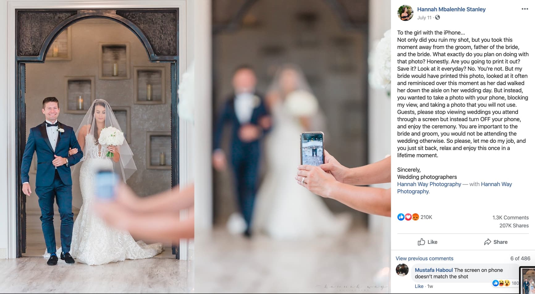 The photographer shared a photo from a wedding she photographed. In it is a guest’s hand, holding a phone, capturing his or her own photo. Unfortunately, the photo is ruined.