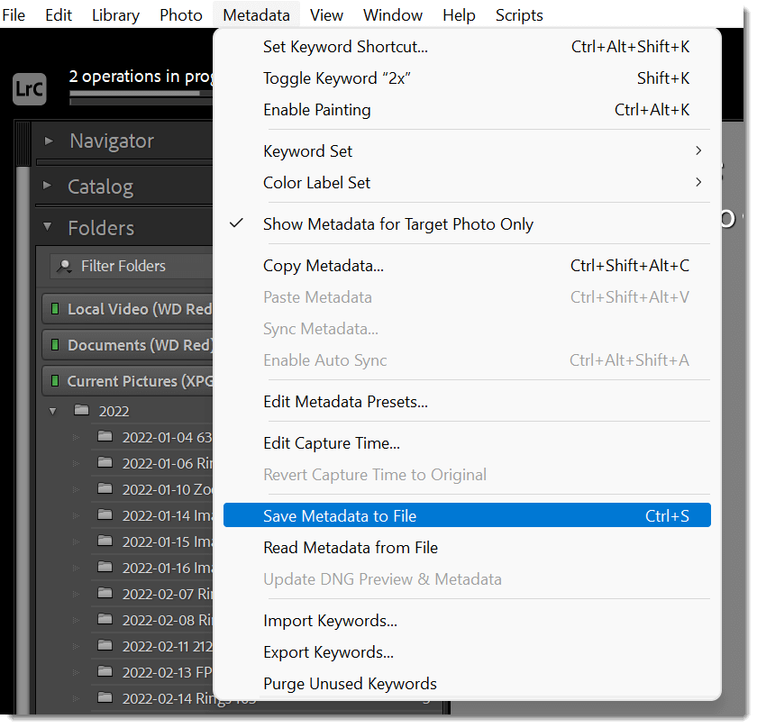 I start with my standard workflow, using Lightroom Classic to import and make a second copy of the images from my memory cards. Next, I save all the image metadata to a file using Lightroom.