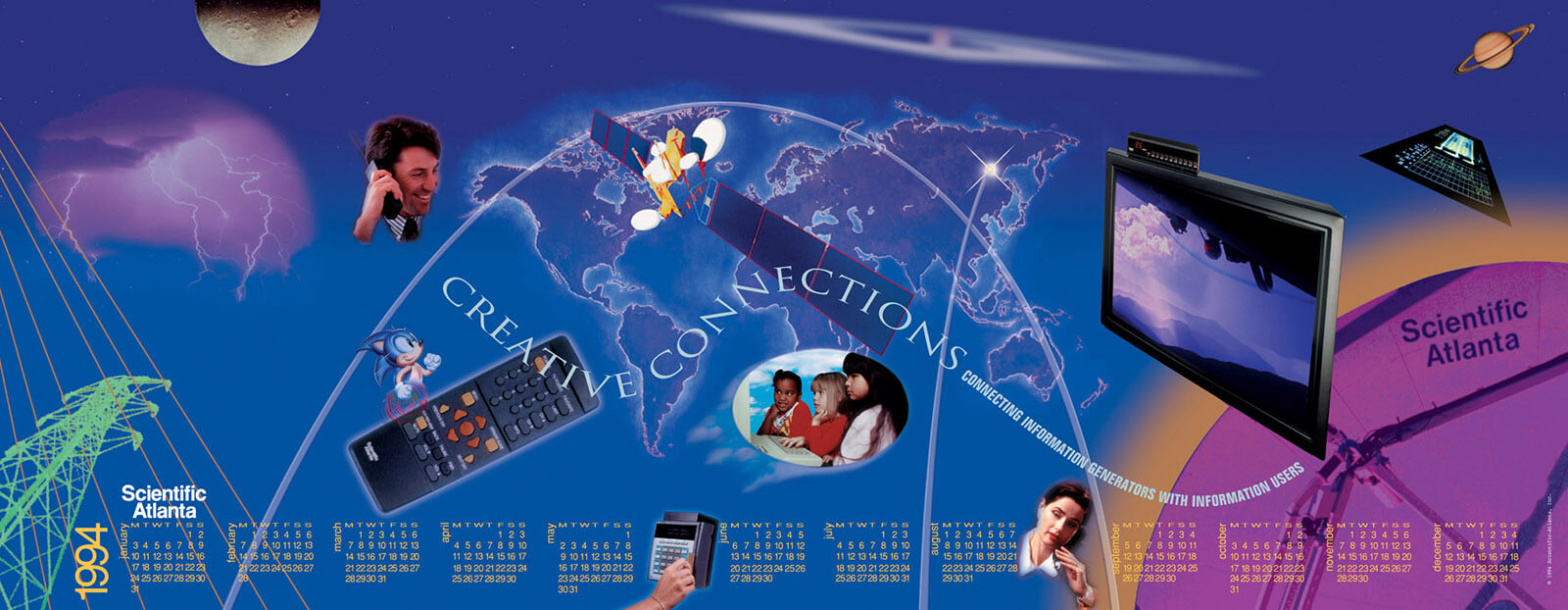 At the end of 1993, Kevin Ames, Eddie Tapp and graphic designer Linda Adams Wellin, were commissioned to create a large, poster calendar for Scientific Atlanta that showed all of the products and services the company offered.