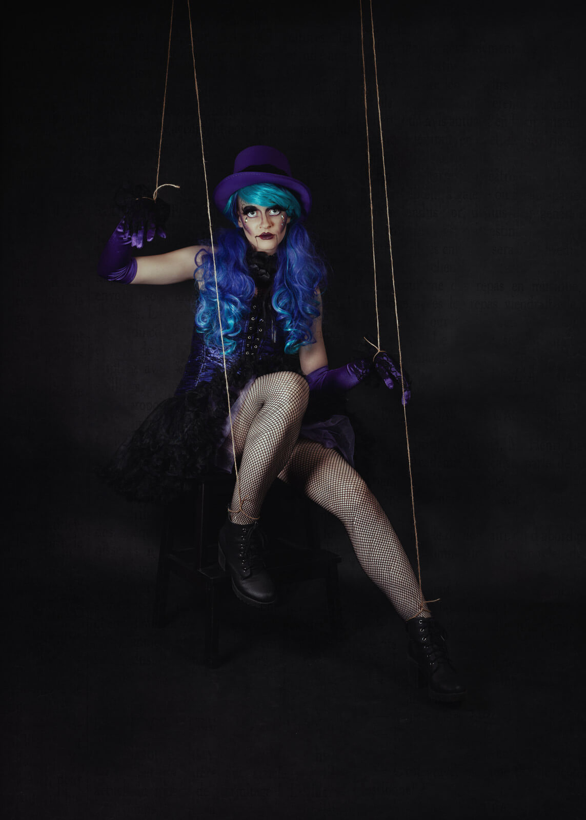 Was a collaboration with HMUA Teighan Felton, Model Andrea Gardiner, the help of my Hubby (aka the Puppet Master) and myself. I pulled together the costume and we shot in the studio with lots of ‘tweaking’ as we went. Originally Teighan and I wanted old school Black and White look, hence the strong makeup and color choices, but decided it looked fabulous in color too. Check out the whole gallery here.