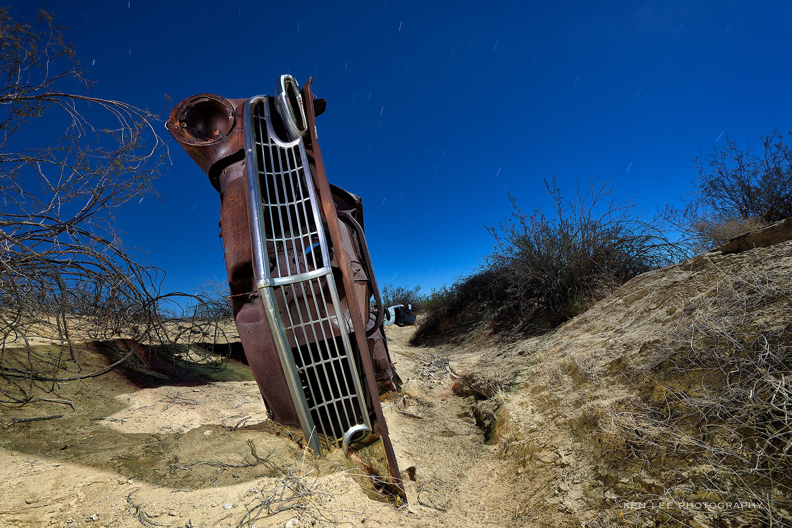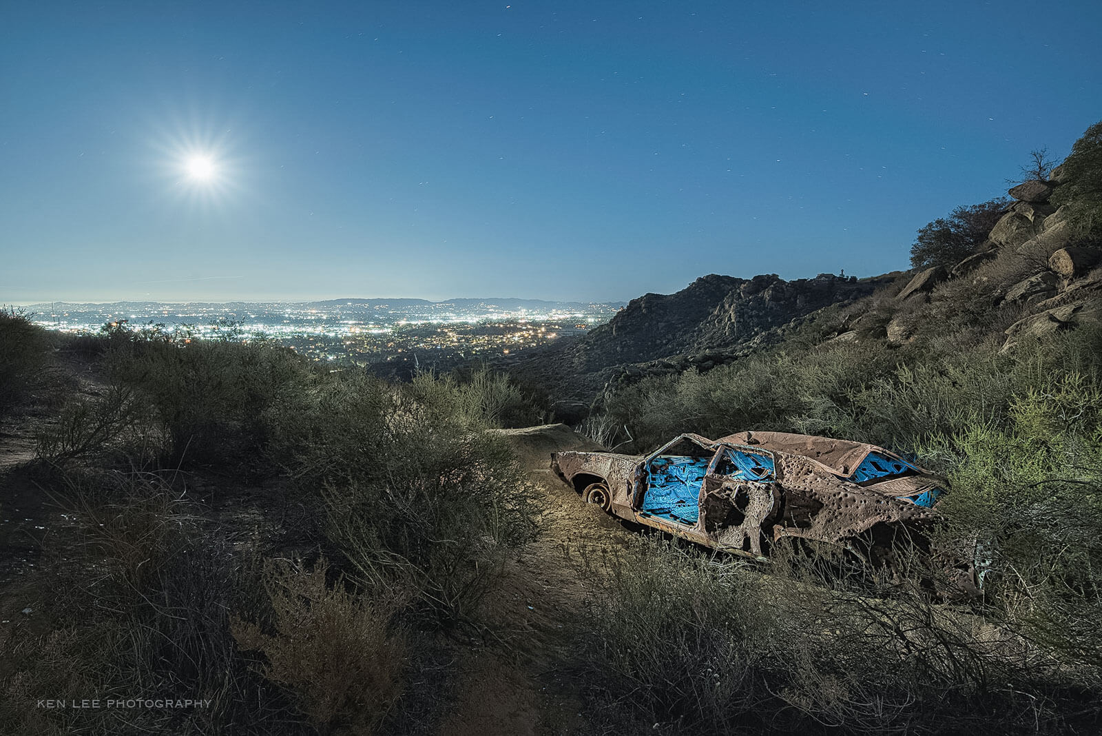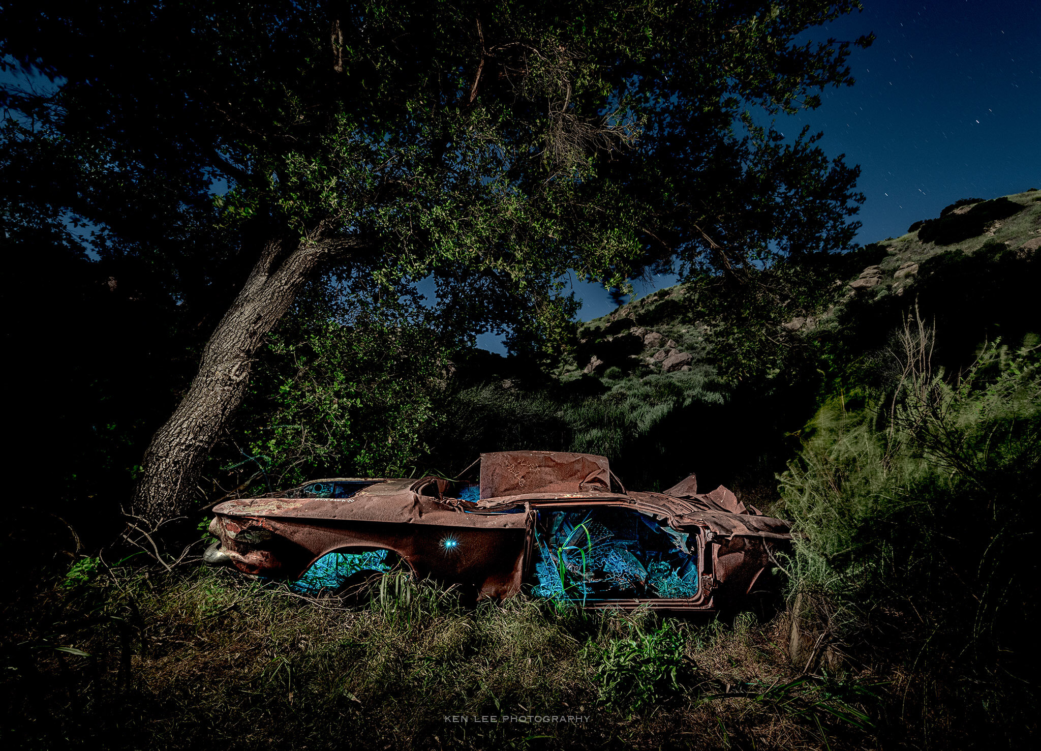 I decided that I would photograph this car at night. To do this, I had to hike through a couple of miles of hillside, the rugged hills illuminated by the moon. I found the car nestled under a tree in a rocky canyon overlooking the lights of the San Fernando Valley. The location was both beautiful and creepy. On my hike back, I took a wrong turn and discovered another abandoned car.