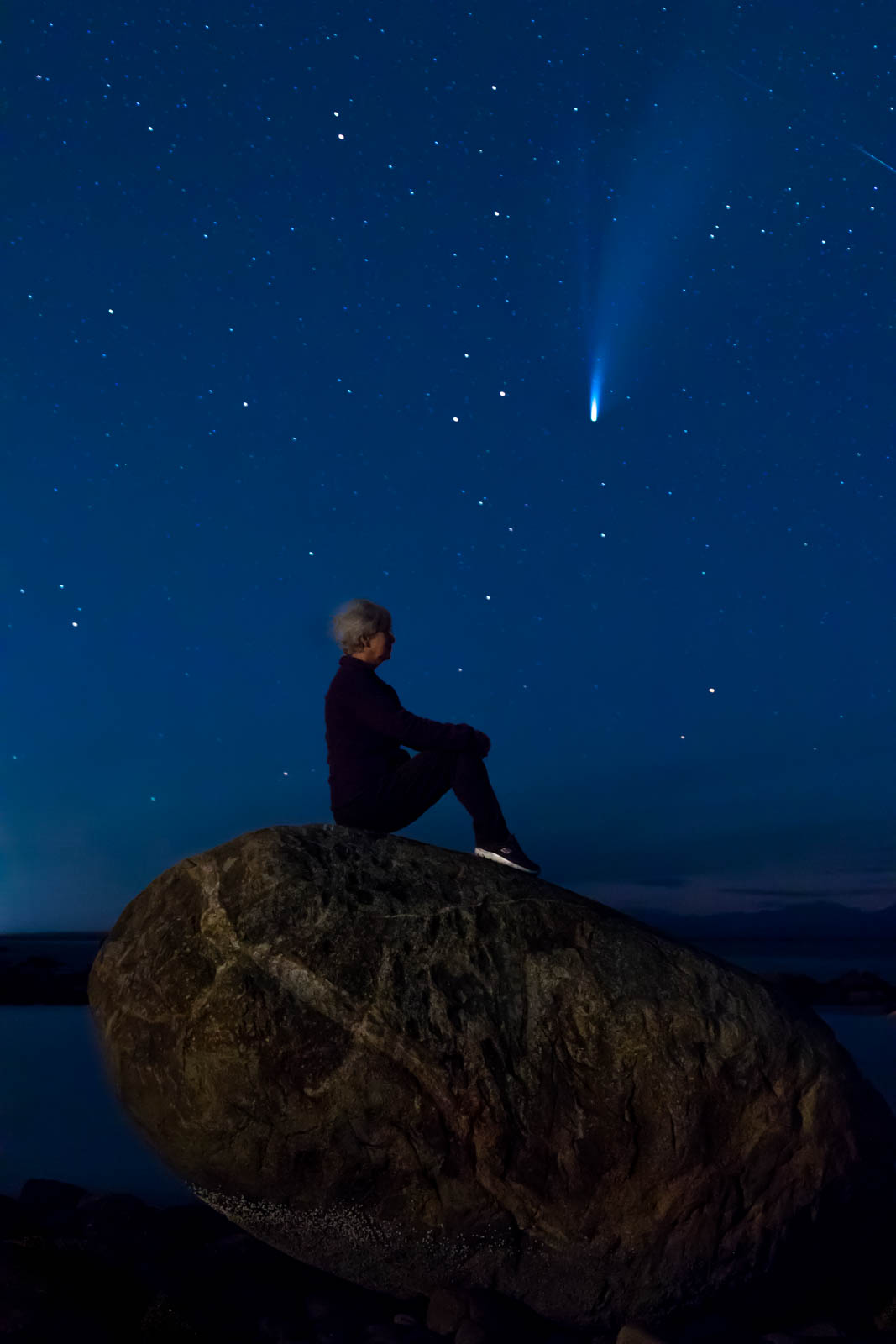 It was at this point that I realized just how much I process out loud when I’m setting up a shot, as I think my mom was quite entertained with my constant stream of consciousness while I frantically worked. I took a few test shots of the rock and the comet, getting my composition and exposure set as quickly as I could. Once that was set, it was time to put myself into the image.