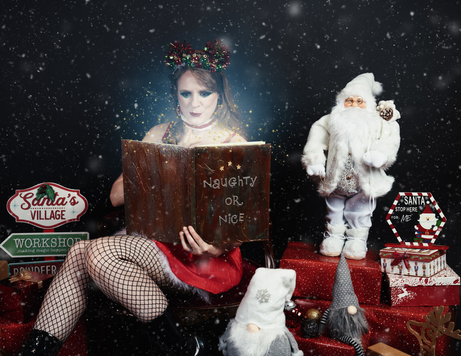 Forget about perfecting the lighting setup. Embrace the chaos by throwing in as many colorful and mismatched holiday lights as you can find. Create a twinkling spectacle that turns your Christmas portraits into a festive disco of laughter. Gels and colored LED’s could work too. Or keep lighting simple and goof off with your theme.