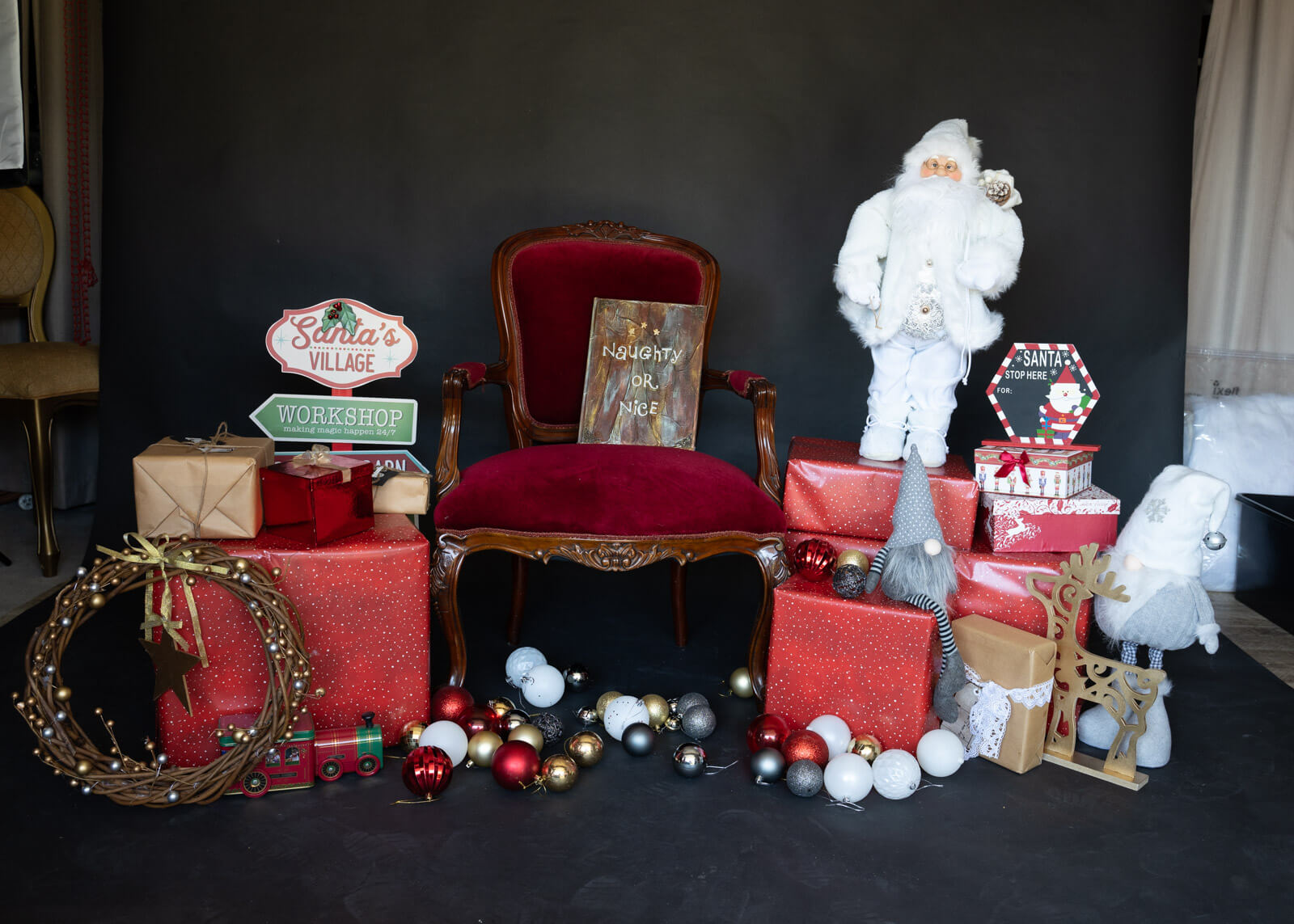 Who needs professional backdrops when you can craft your own masterpiece? Unleash your inner DIY guru with nonsensical scenes — think flying reindeer, gingerbread house mishaps, or a snowman disco party. The crazier, the better! Or keep it plain and wrap old cardboard boxes, throw in armloads of baubles and have some fun.