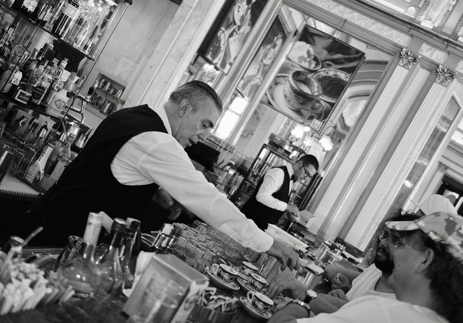 In Naples, I tried to capture the feel of Italy by photographing a typical Italian barista in a coffee bar who was making espressos incredibly quickly. He’s impeccably dressed, as is the custom in Italian restaurants. For me, this black-and-white photo depicts the city as I experienced it, as I felt it.