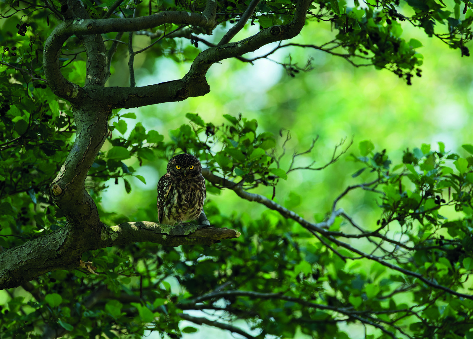 I’m crazy about owls and went to a farm that has several resident owls. Barn owls are often found on farms because they like to nest in old buildings. I waited in the hide by the old wagon wheel where the owls like to perch, pleased with my perfect shooting position. But this time the owl surprised me. He swooped over the wheel and flew up into the tree, choosing a new spot for the first time. He sat there as if observing how I would react to this change in plans. His intense look, combined with the backlit leaves and branches, created a magical photo. It wasn’t what I expected, but it was still perfect.