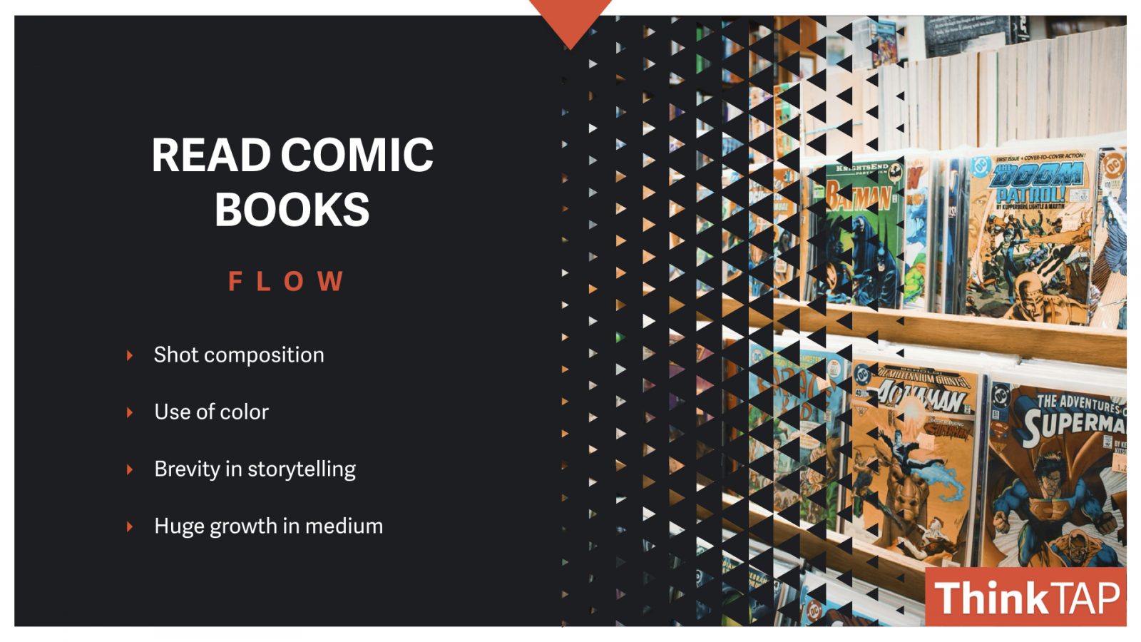 The great thing about comic books is you’ll learn about flow. This really helps you understand how ideas flow together. Shot composition, great ways to design composition. If you look at comic books, there are no limitations to where the camera was, so you’ll see incredible shots. You’ll see people design things that are just awesome. Great compelling images to look at, and it will push you to discover new angles for your and videos.