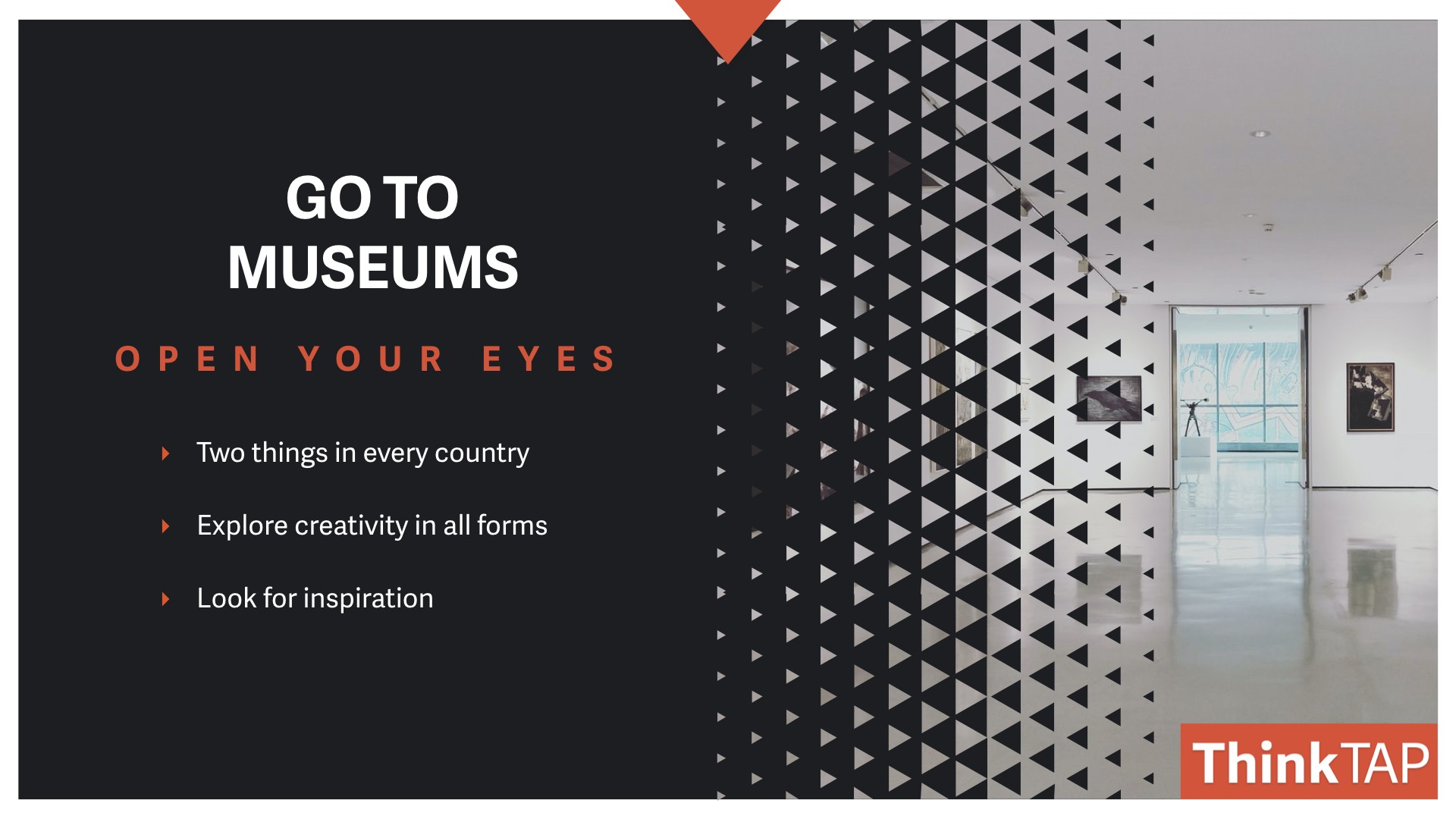 Here’s one that I always tell folks. Go to museums, learn from the past and experience the future. What’s excellent about museums is you can really open your eyes.