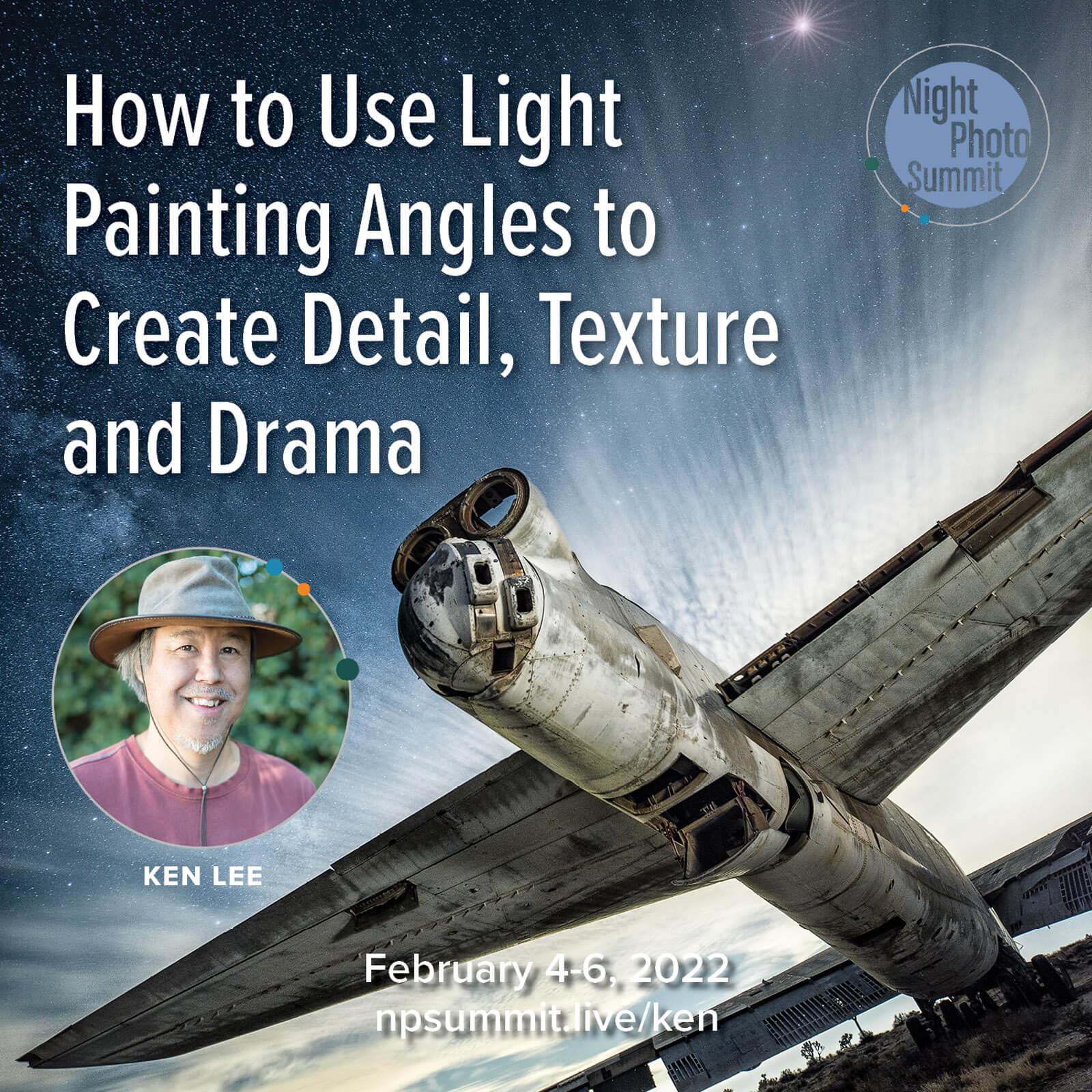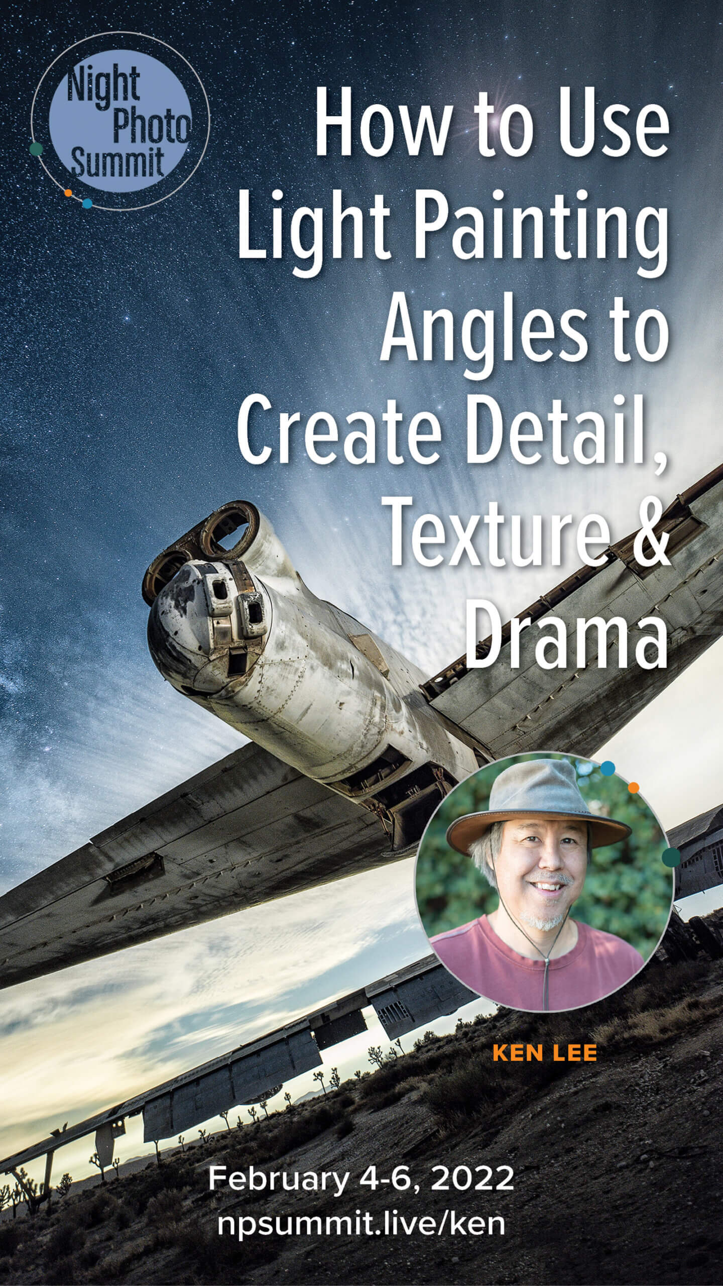 The well-respected National Parks at Night held their first Night Photo Summit last year. This was a great success. Consequently, they’ve decided to hold another Night Photo Summit this year as well. I am also deeply honored to say that I am one of the 25 presenters. My presentation will be “How to Use Light Painting Angles to Create Detail, Texture and Drama.” I will expand on creating detail and texture from this article.