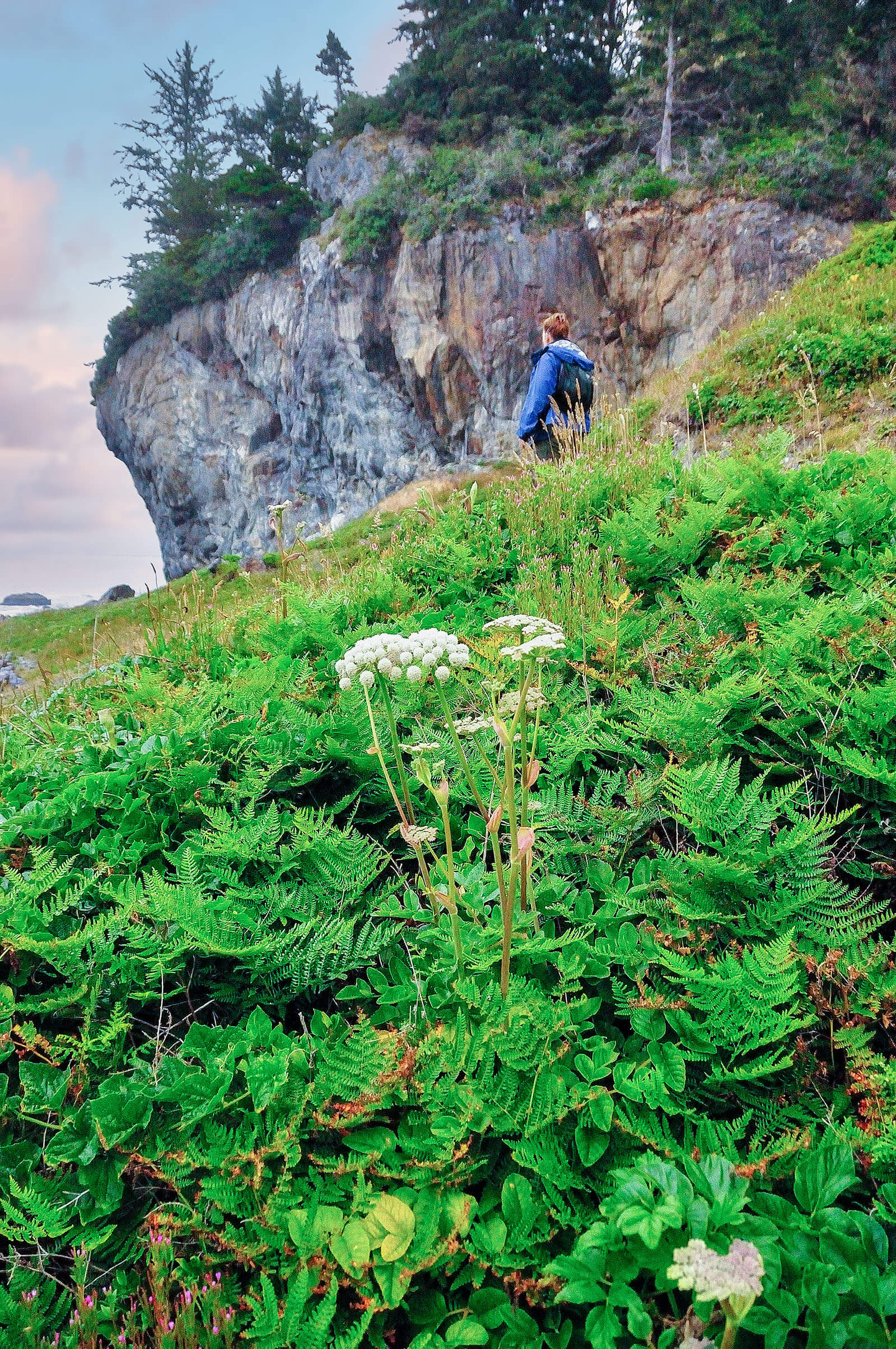 Go north from Black Sands Beach. The first nine miles is primarily on the beach. The crunch of the black stones while walking is quite loud, eventually giving way to sand. You’ll occasionally see scruffy people with backpacks who have walked along the entire stretch of the trail. The trail eventually heads into redwood groves and fern glens in Sinkyone Wilderness State Park. You may camp north of Telegraph Creek.