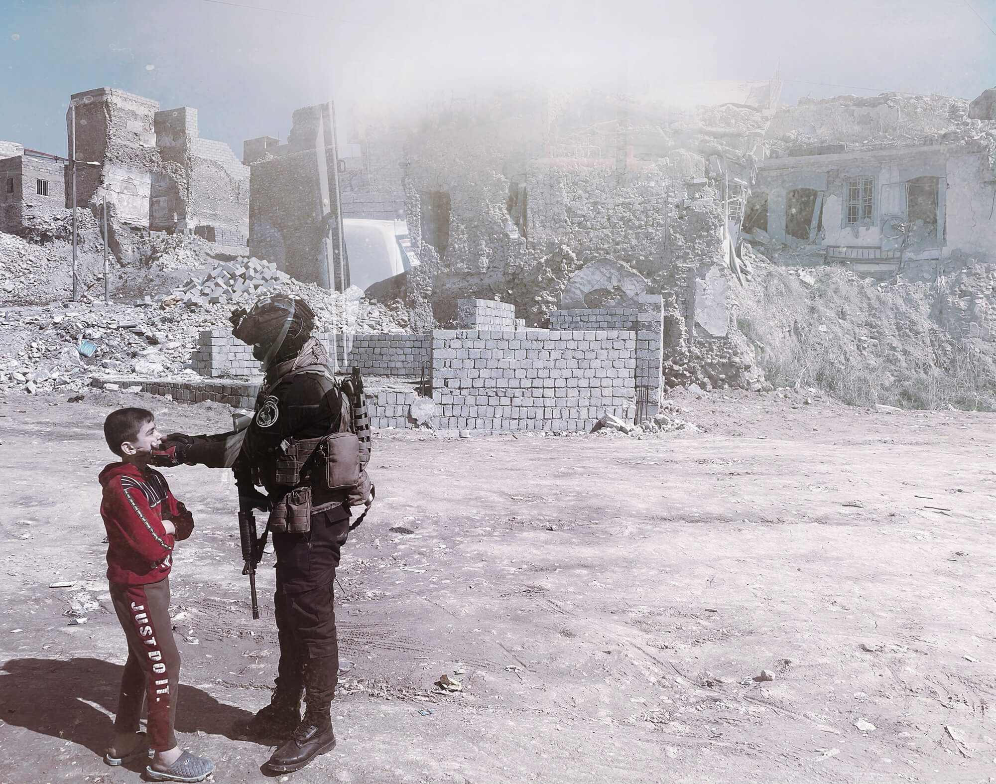 Shot with an iPhone 11, “The Kid of Mosul” showcases a moment of tenderness between a young boy and a soldier in the dusty rubble of war. The photograph was taken in Mosul, Iraq.