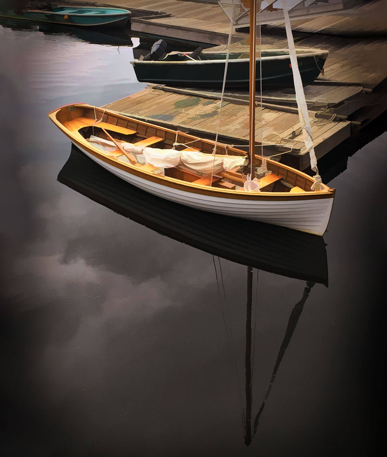 Ed created this image at the harbor in Camden, Maine. He would describe this as waiting. Boats waiting for their sailors. He really loved the colors of the boat and wharf and the reflections captured in the water.
