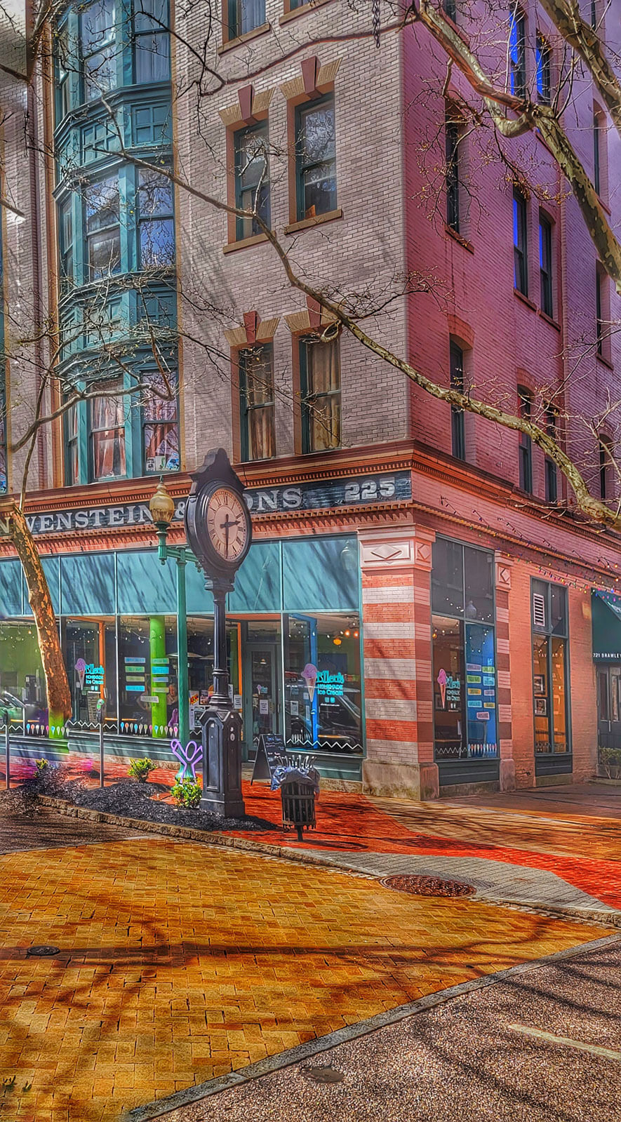 This is a scene from Plaza Street in Charleston, West Virginia. Renee kind of felt like this represented a walk down memory lane. She likes the old-time feel along with the textured brick street and the old clock.