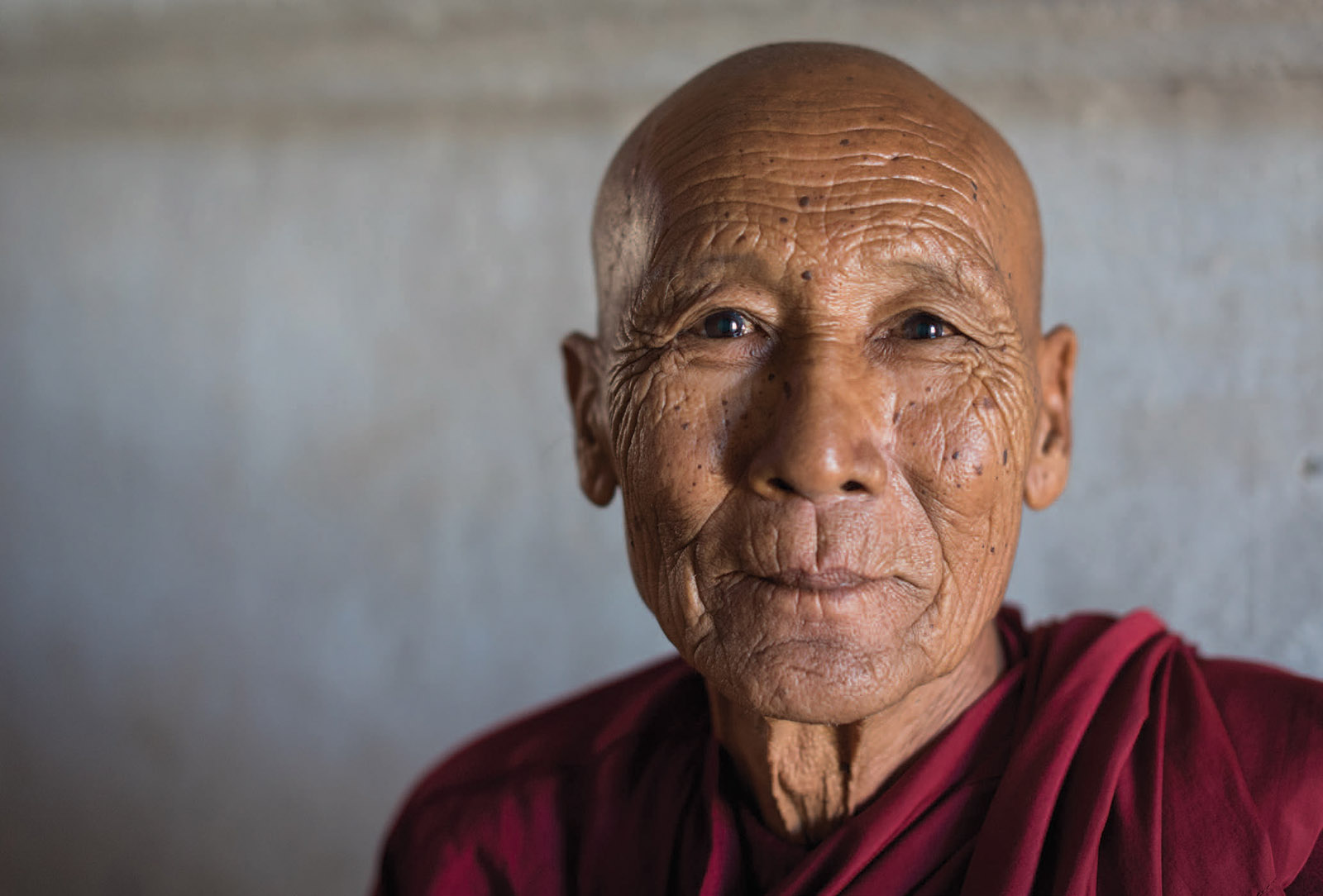 One of the monks watched us for a long time. Eventually, he walked over and asked if he could take a photo of us. We were happy to pose for him so he brought out a really old phone with a camera in it. Every time he pressed the button to take a photo, he accidentally lowered the phone making his photos unsuccessful. It took quite some time for him to take a sharply focused picture of us. Because we’d established a connection with him, we felt comfortable asking if we could take a photo of him too. He also agreed. The monk was an elderly man with an extraordinary face, full of character, perfect for a photo. I quickly put my 50 mm lens on my camera and put him in the right light. After just three or four shots I had the perfect photo — his character really shines through. If he hadn’t asked us to let him take our picture, I wouldn’t have dared approach him. The barriers were down, so to speak.