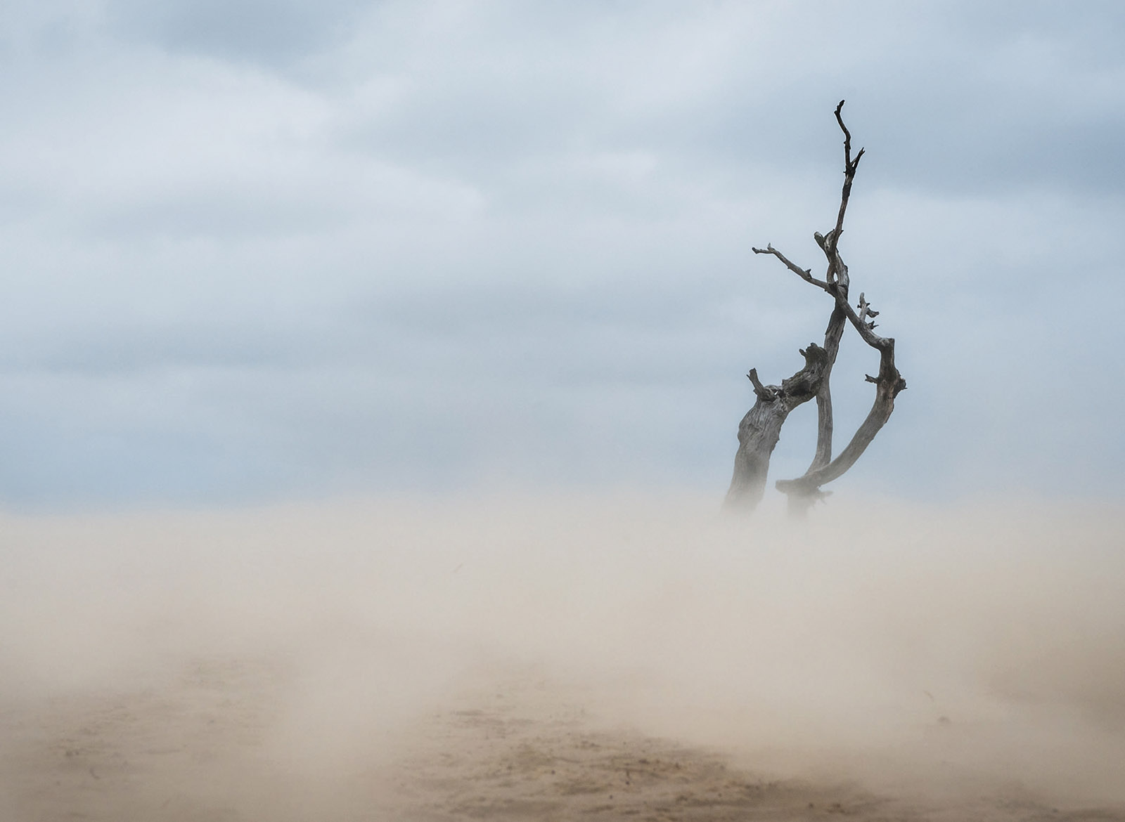 In this region, the wind really does shape the landscape, creating fabulous patterns. I waited for a code-orange storm with strong winds to photograph it. The wind blew all day long and my footprints constantly disappeared in the sand. I was standing in the middle of the dunes, being almost blown off my feet. Sand was everywhere — in my eyes and camera, absolutely everywhere. At the time, I couldn’t care less because it was so fantastic to see and photograph what was happening. The sand was being blown over the ground, and it was like seeing the Northern Lights dance but then at ground level.