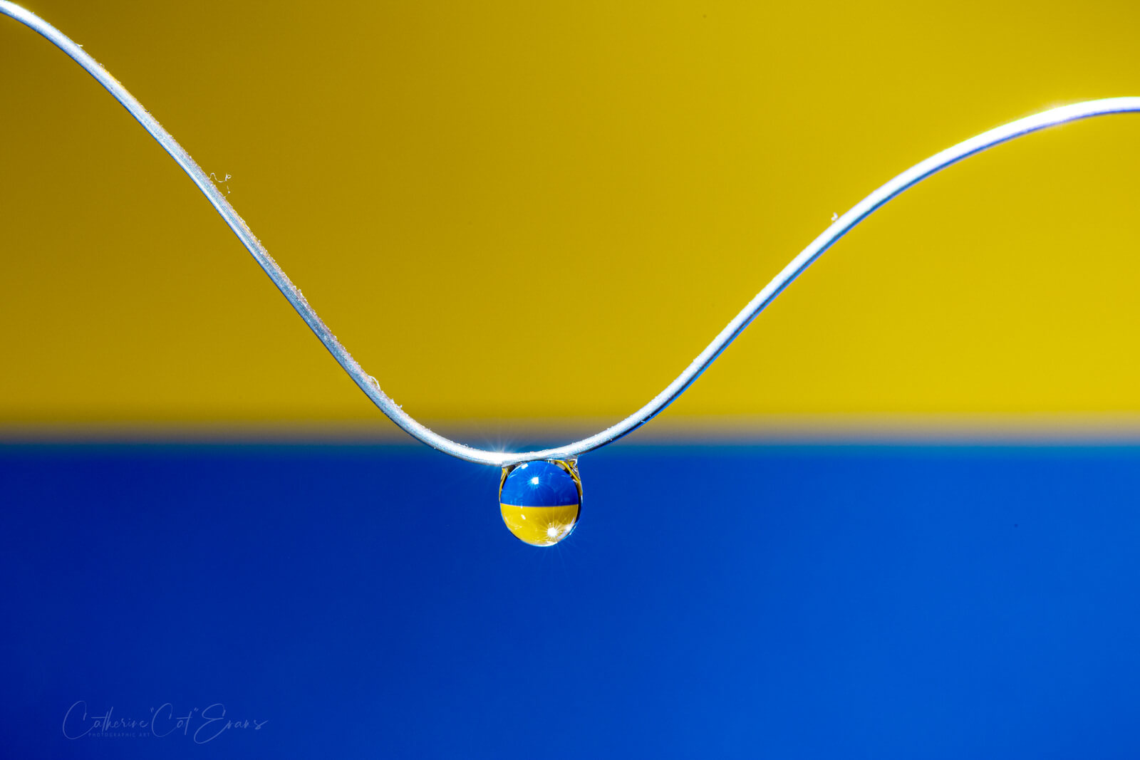 Early on in the conflict, I started noticing artists posting photos and other works with blue and yellow, showing their support for Ukraine. The work of one photographer, in particular, caught my eye — Catherine “Cat” Evans. She photographs a variety of subjects, but one of her passions is macro photography, and water drops in particular.
