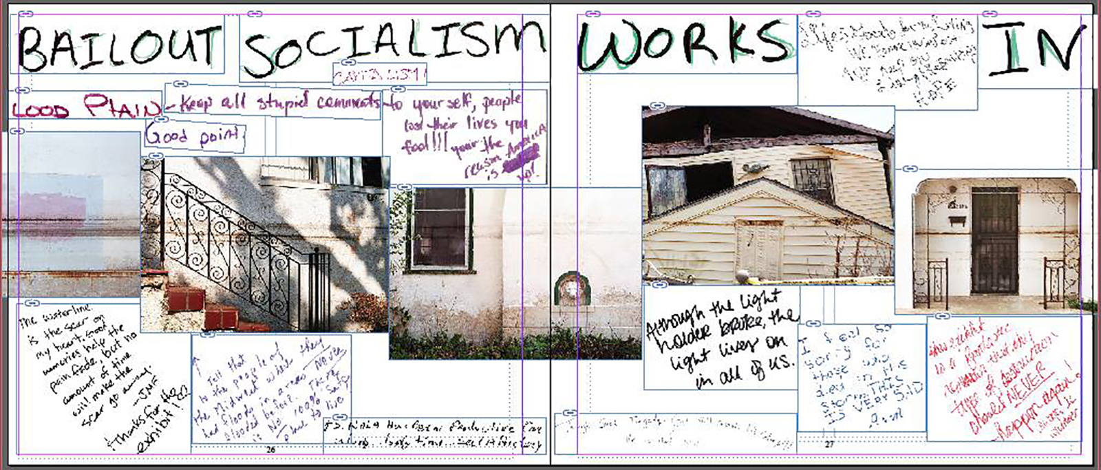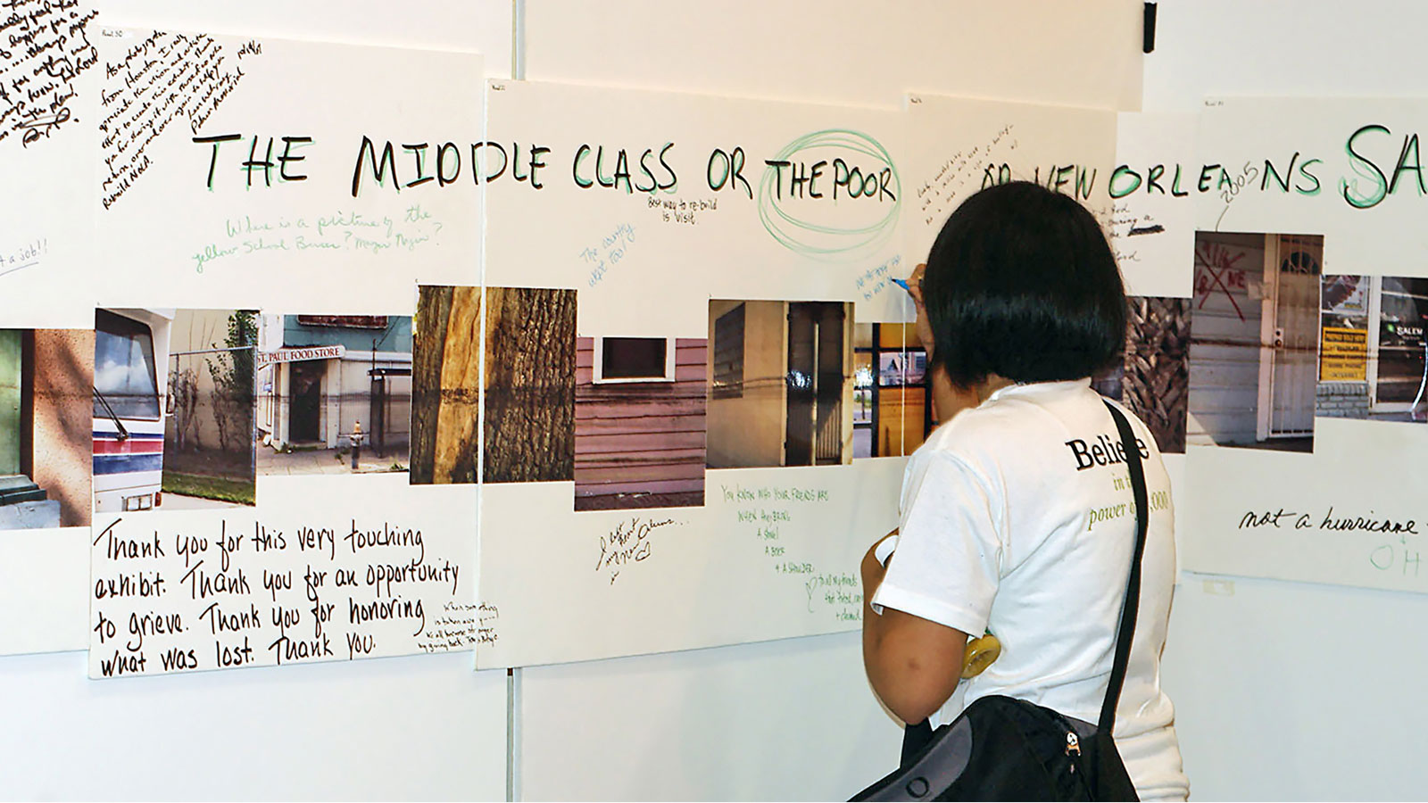 And it was interactive, garnering hundreds of comments written on the foam core panels above and below the photographs that reconstructed the water lines left by the receding flood of Hurricane Katrina. The comments came from hundreds of viewers who saw it in 15 installations around Louisiana and one in Florida between fall 2006 and its latest and perhaps final installation on the 10th anniversary of Katrina in fall 2016.
