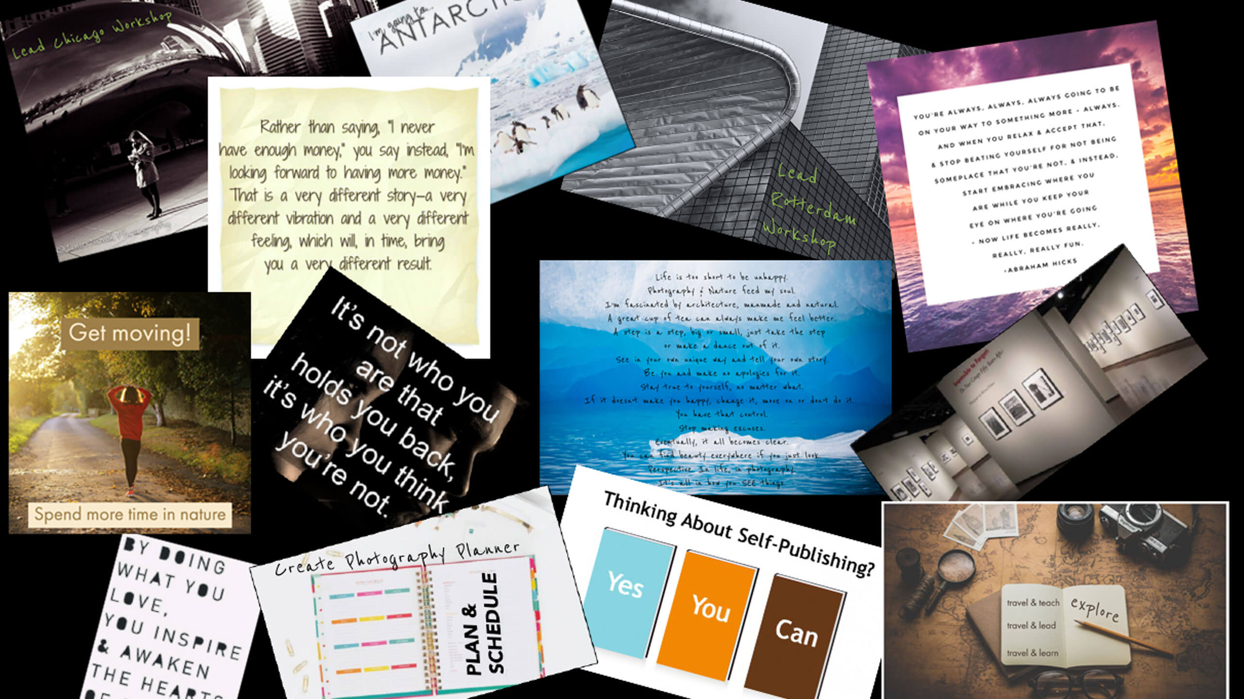 “I made my first vision board in early 2015 and I did it rather reluctantly. After all, aren’t vision boards for dreamers and in the realm of woo woo wishful thinking? But alas, I found myself challenged to at least give it a try and after committing to it, I set out with scissors and glue and poster board and went old school on it. On it was travel as a guide to Antarctica, to do a Ted talk, to have a studio with old wooden floors, travel to Africa, presenting to audiences, CreativeLive and quite a few other things. Within a few days of completing the vision board, a future trip to Antarctica became a reality and over time, everything and more listed above came true. Except I haven’t been on CreativeLive …… yet ……