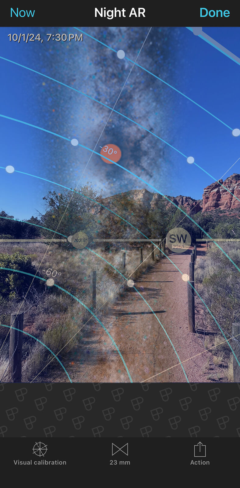 What is Milky Way augmented Reality? PhotoPills AR superimposes the Milky Way and the Galactic Center over the scene in front of you. Your phone camera is activate and shows you the scene and can captures what your screen is showing including date and time set. The Galactic Center is represented by the orange circle. The beauty of this is you can visit a location during the day and see where the Milky Way will be at any time and any date past present or future. And, you can save a picture of the scene in your camera for future reference. See how I used it below.