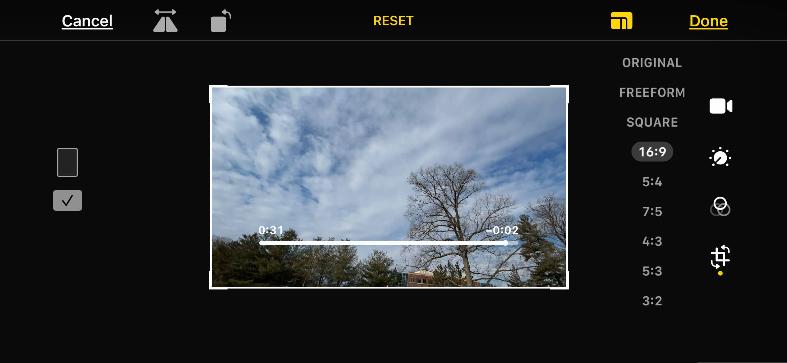 Using the Crop tool I could remove the flag. I was sure to keep the 16:9 aspect ratio of the original shape. Because the video is 4K, I can easily crop and still export a 1080p HD video.
