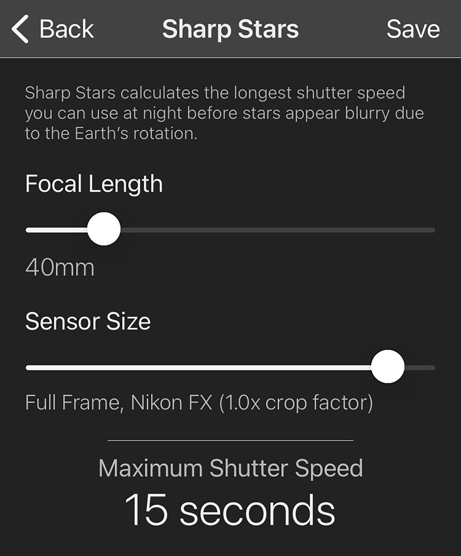 Under the Calculations menu, Cascable offers figuring out the exposure length required for a specific neutral density filter and how to get sharp stars based on focal length and sensor size, which it automatically determines for the camera that is already engaged with the app.