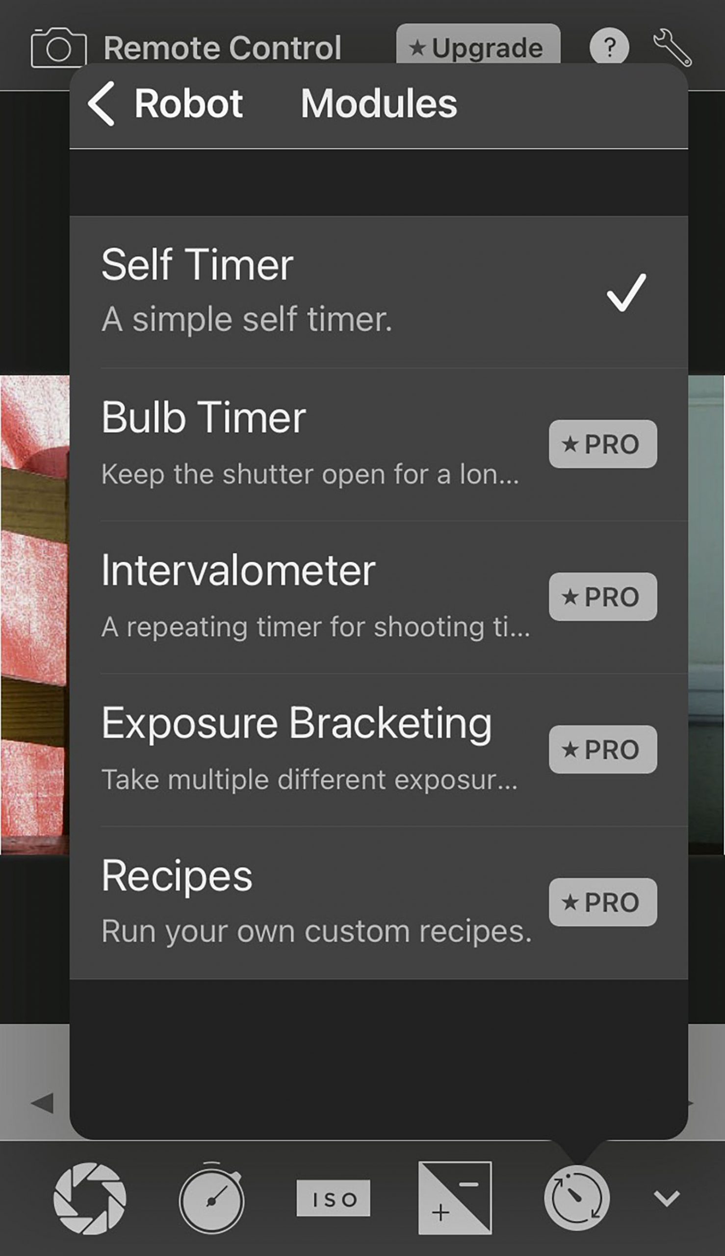 The Shutter Robot allows you to control the self-timer. If you opt to upgrade to the Pro version, you may also use this for more advanced controls, such as a bulb timer, intervalometer, exposure bracketing and creating your own custom recipes. You can easily engage these parameters or disengage them with a single touch. As a bonus, the app remembers your settings.