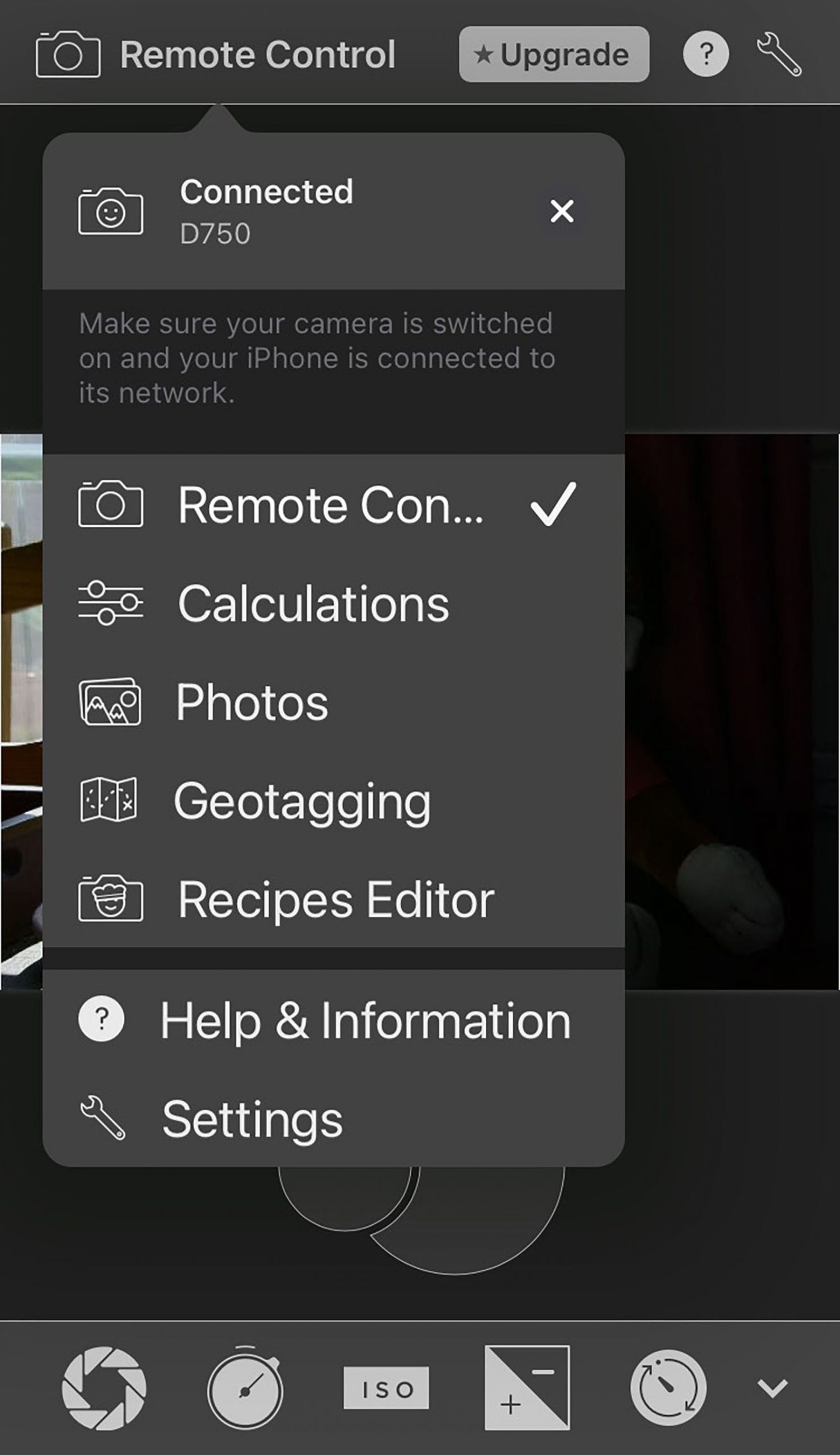 After acquiring the signal, I pressed Remote Control. I was excited to see what the app could do. Immediately, I noticed that I could adjust the parameters of the camera easily. The bottom icons allowed me to adjust aperture, shutter speed, ISO, EV and the Shutter Robot (a little more on that later).